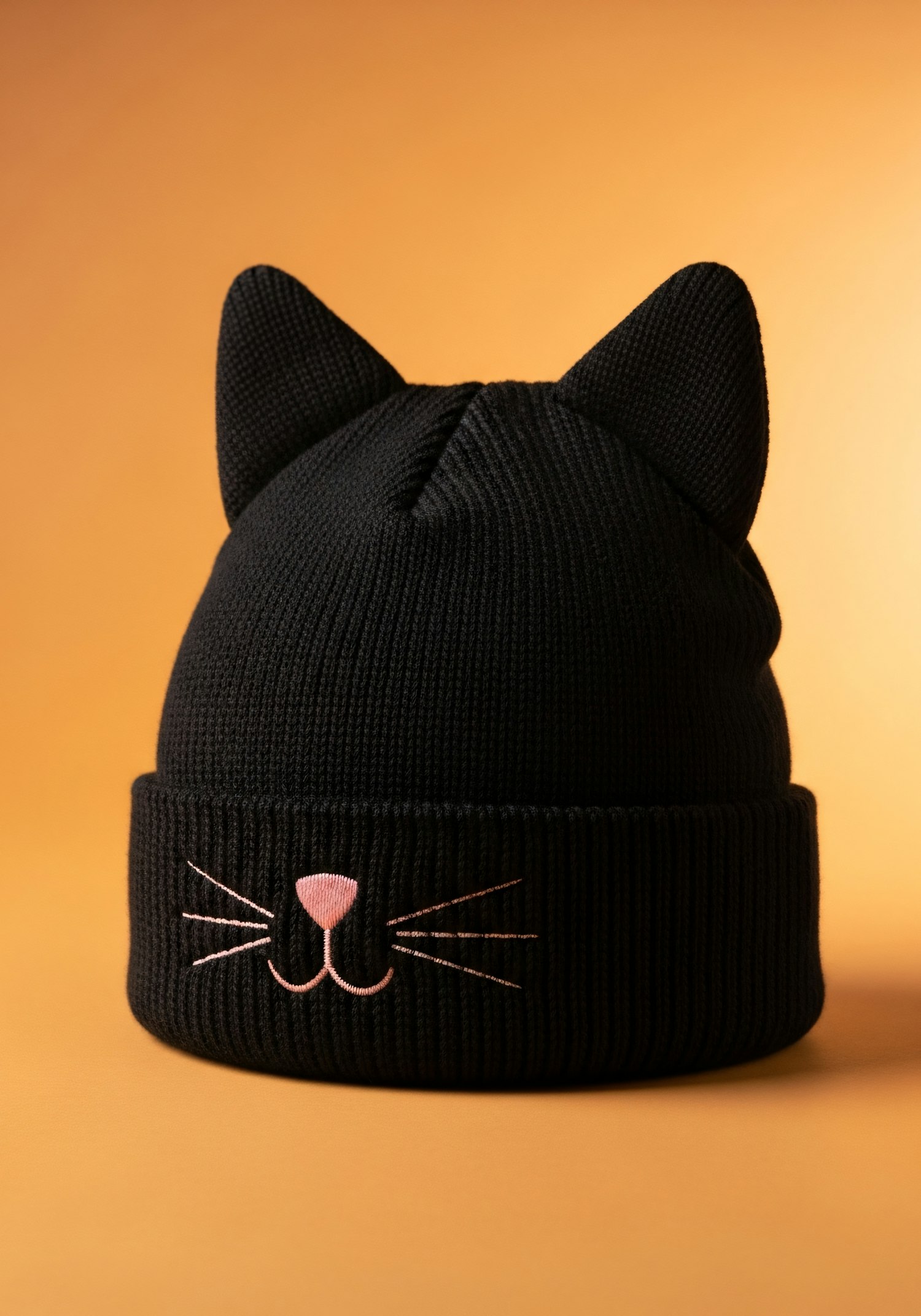 A black beanie with cat ears and a cute embroidered face on a warm orange background, perfect for cozy and playful fashion.
