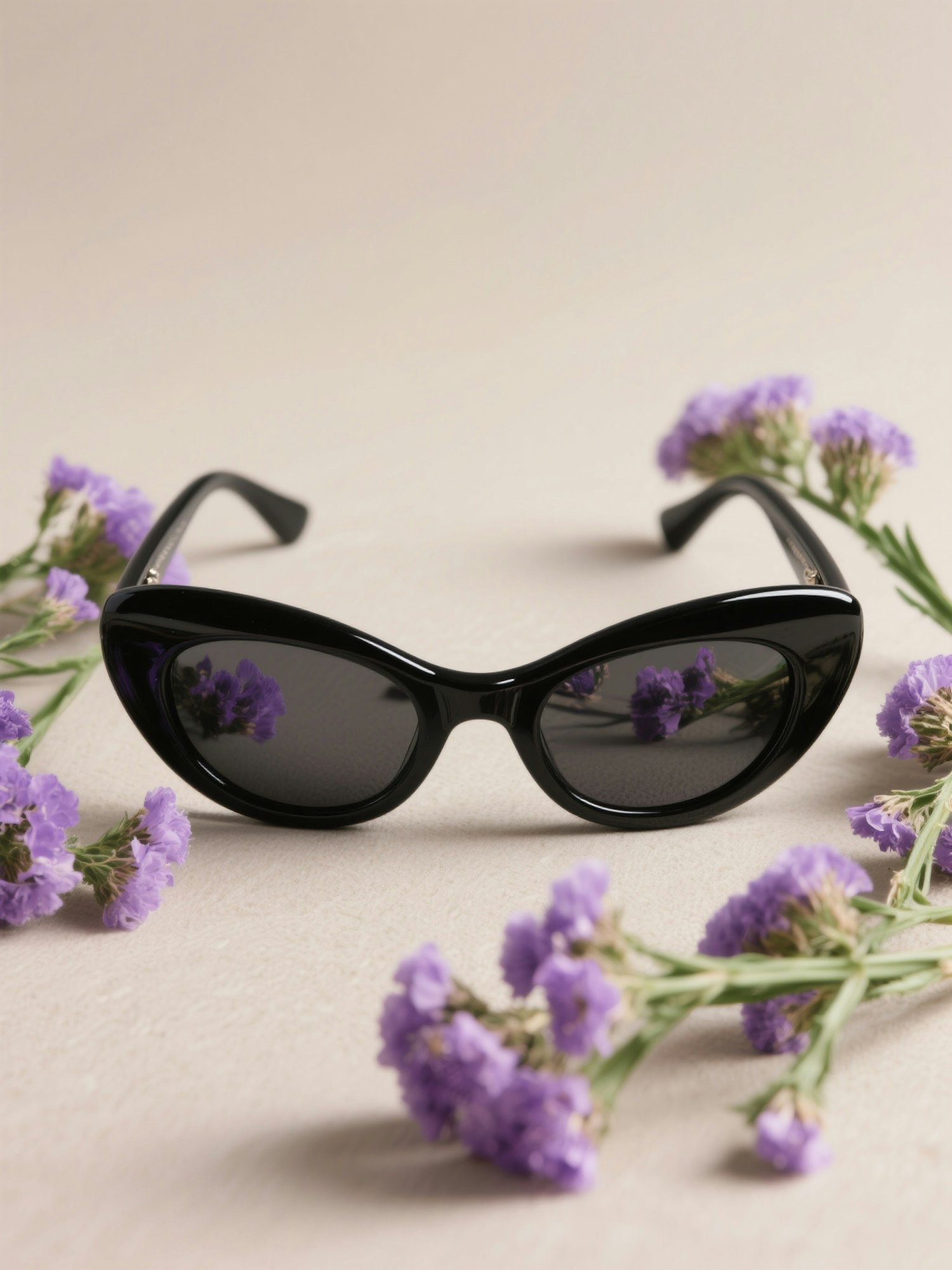 Stylish black cat-eye sunglasses surrounded by delicate purple flowers on a beige background, perfect for a chic and natural vibe.