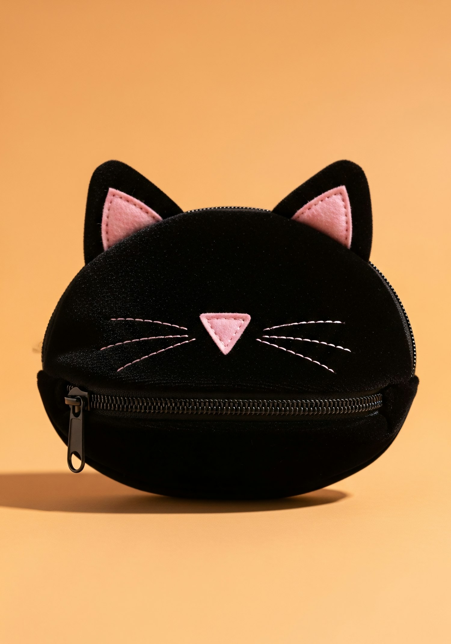 A cute black cat-shaped pouch with pink details and a zipper, set against a warm orange background.