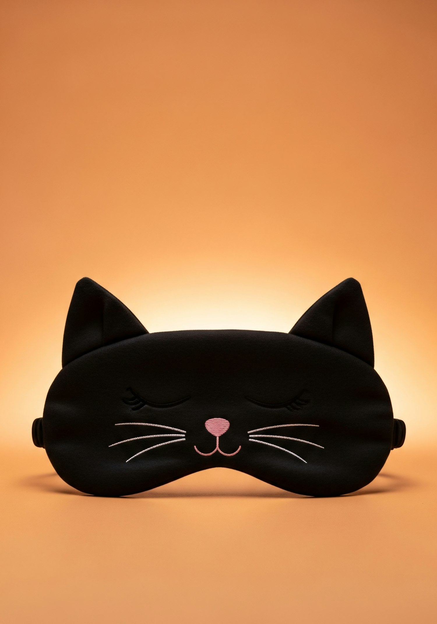 A black cat-themed sleep mask with embroidered details on a warm orange background, perfect for a cozy and stylish sleep accessory.