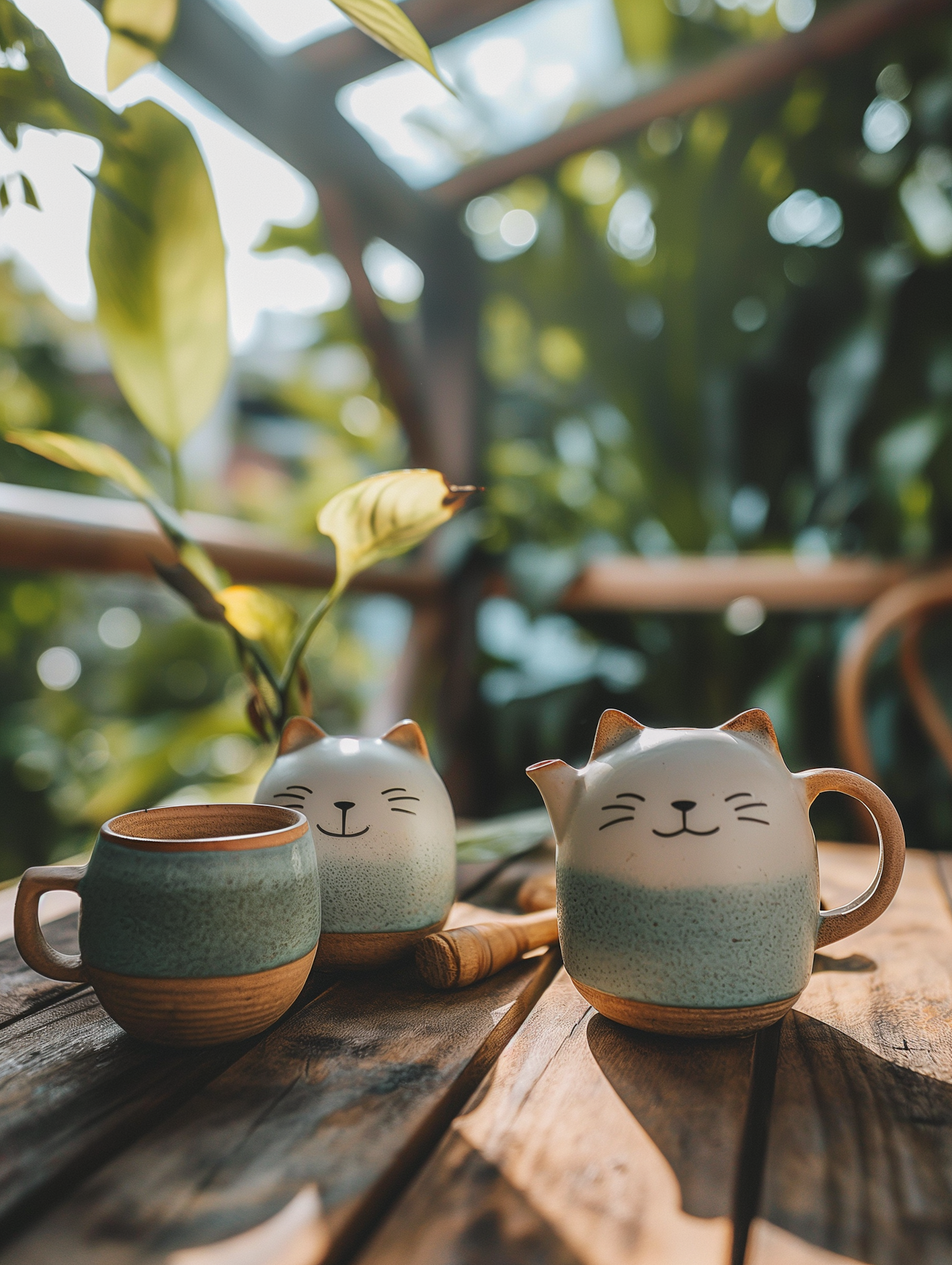 Whimsical cat-themed ceramic tea set on a sunlit wooden table, surrounded by lush greenery. Perfect for a cozy tea time.