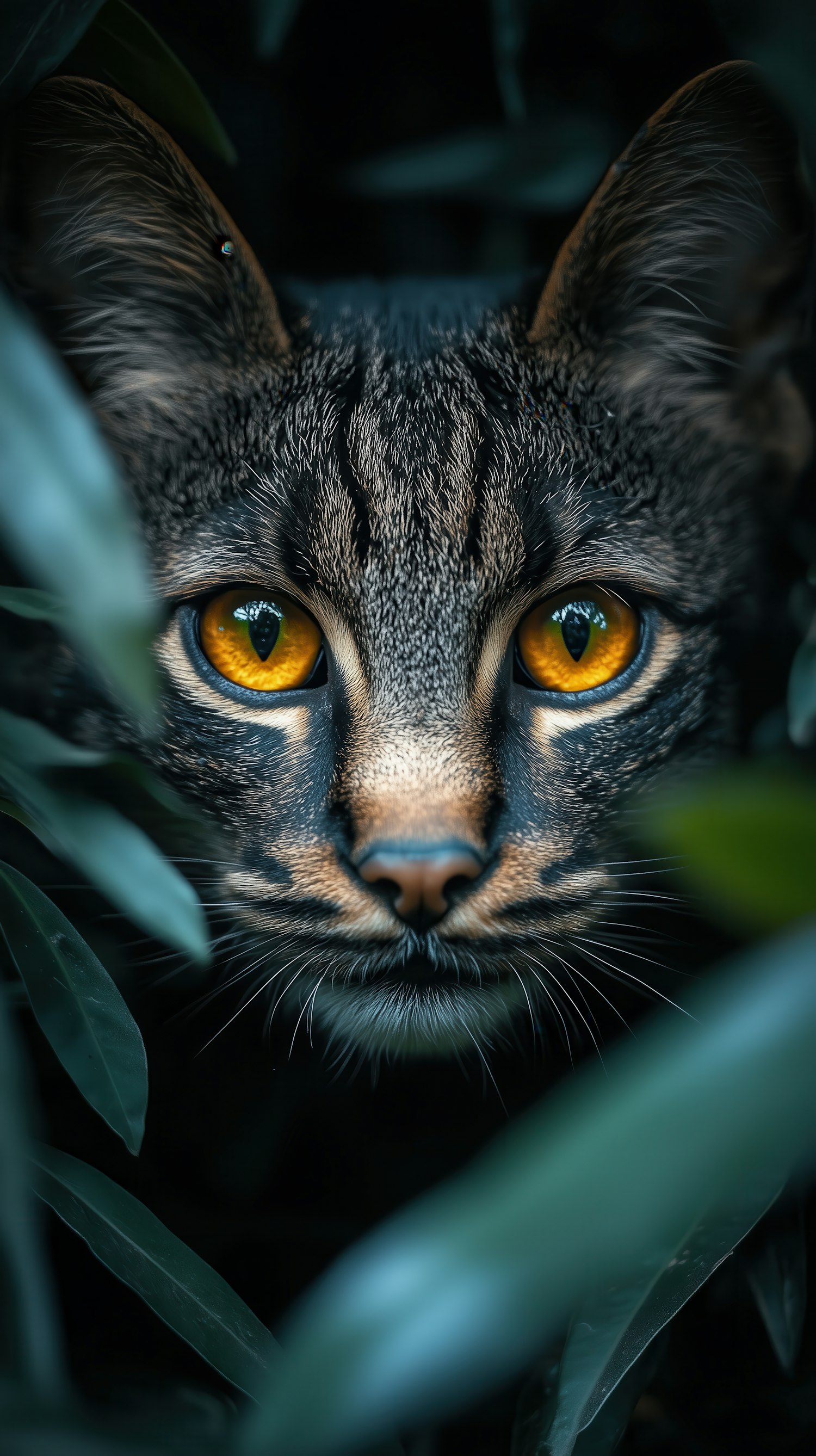 Close-up of a cat with striking amber eyes peering through lush green foliage, creating a mysterious and captivating scene.