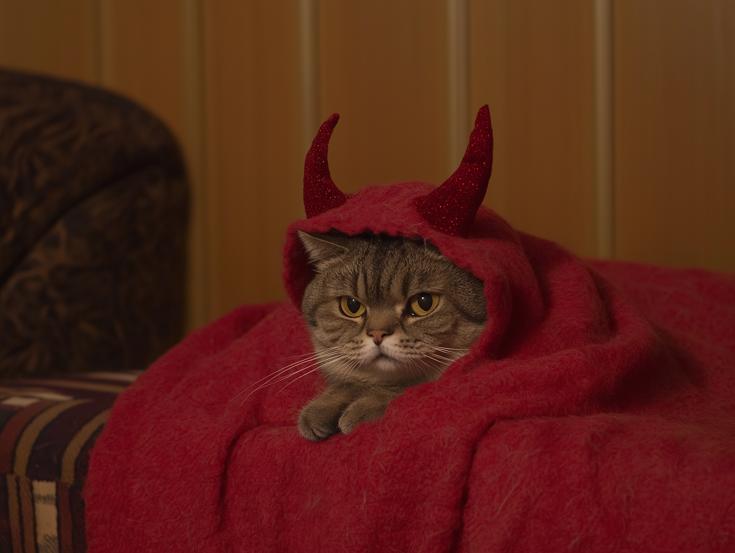 Adorable cat wrapped in a red blanket with devil horns, lying on a cozy couch. Perfect for Halloween or playful pet themes.