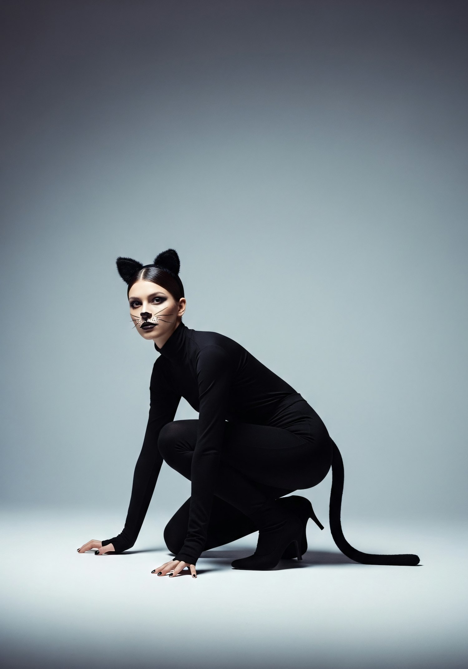 A person in a black cat costume crouches on a neutral background, featuring cat ears, a tail, and feline-inspired makeup.