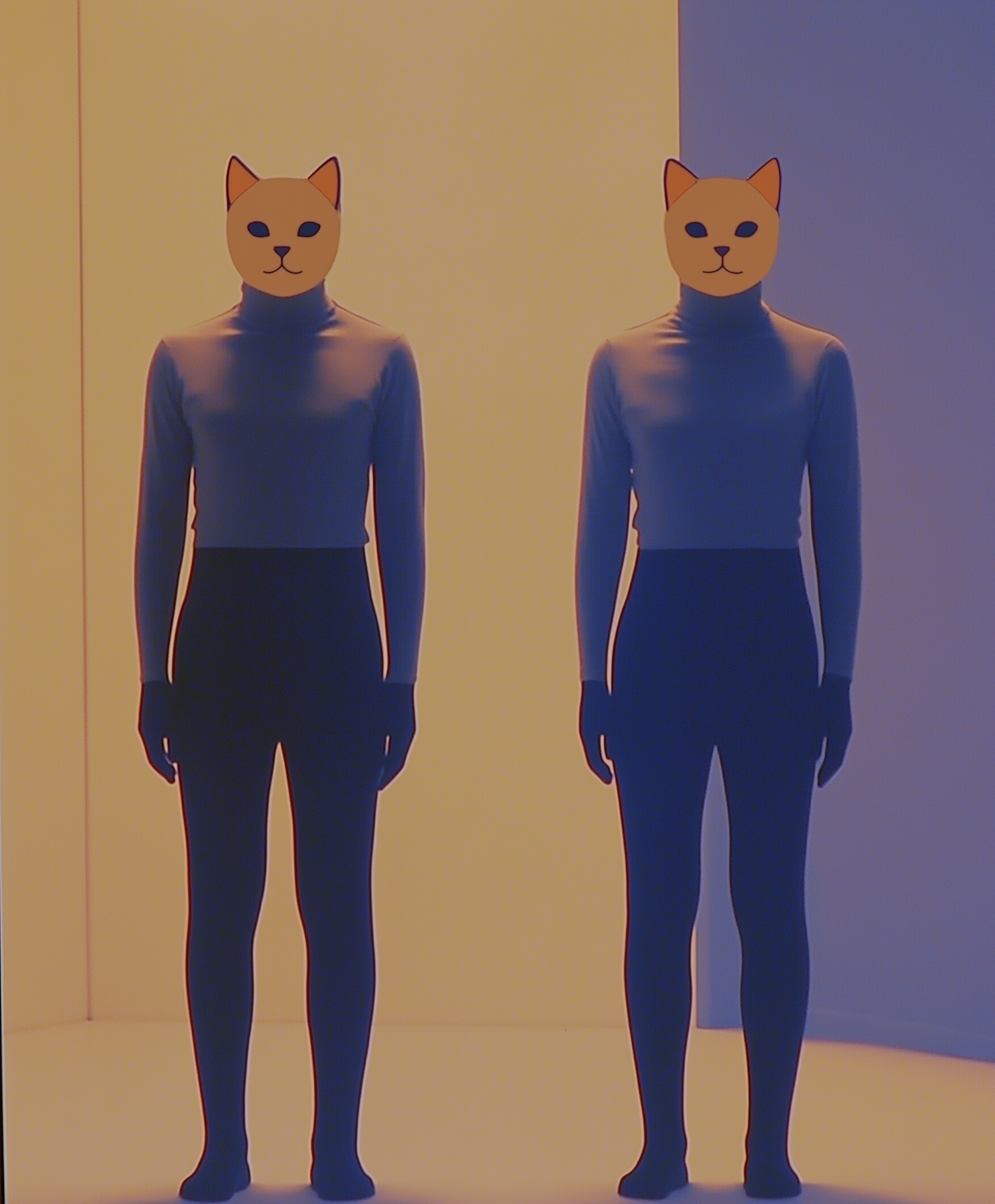 Two figures in cat masks stand in contrasting orange and blue lighting, creating a surreal and artistic scene.