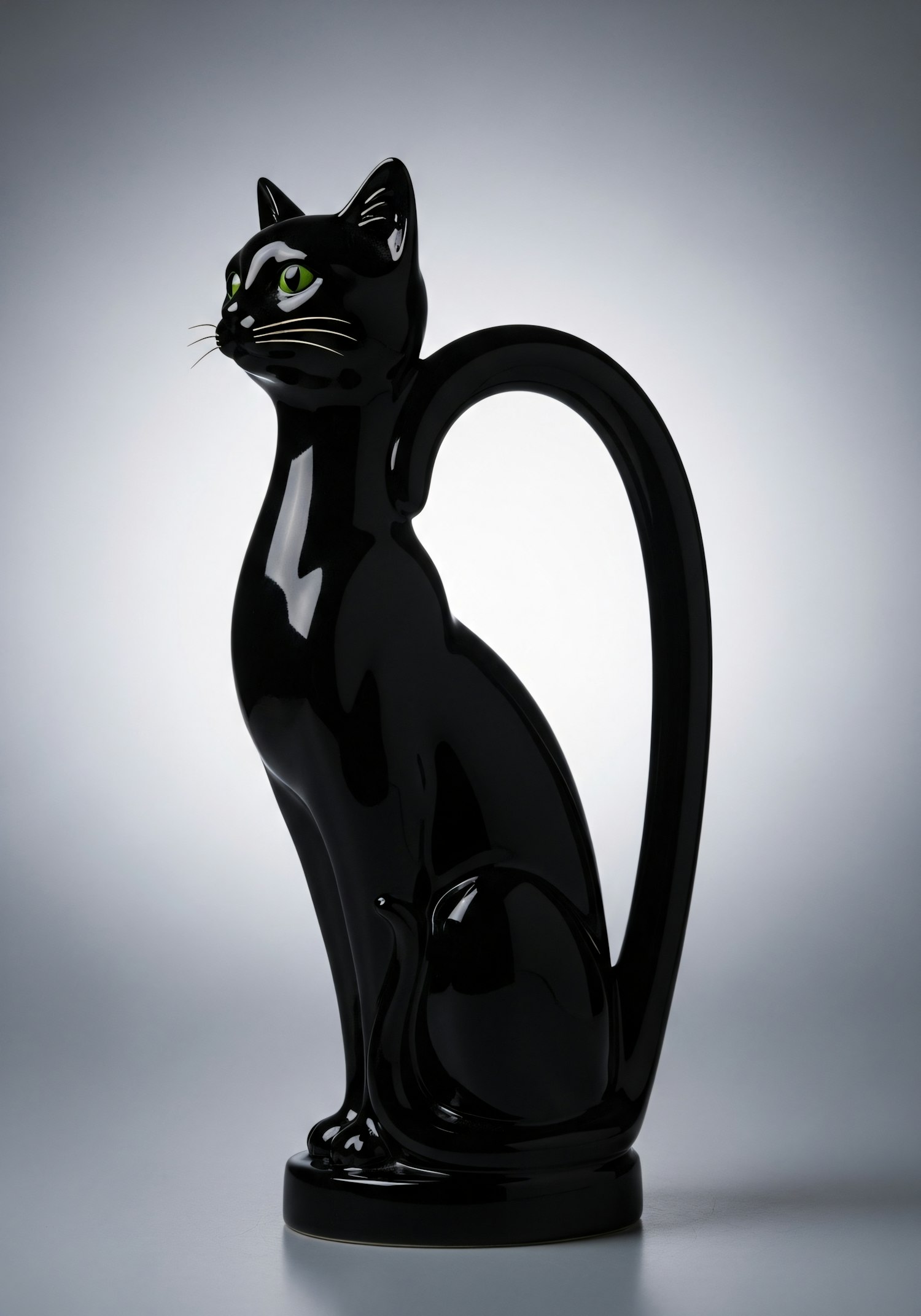 A glossy black ceramic pitcher shaped like a cat, featuring green eyes and a curved tail handle, set against a soft gray background.