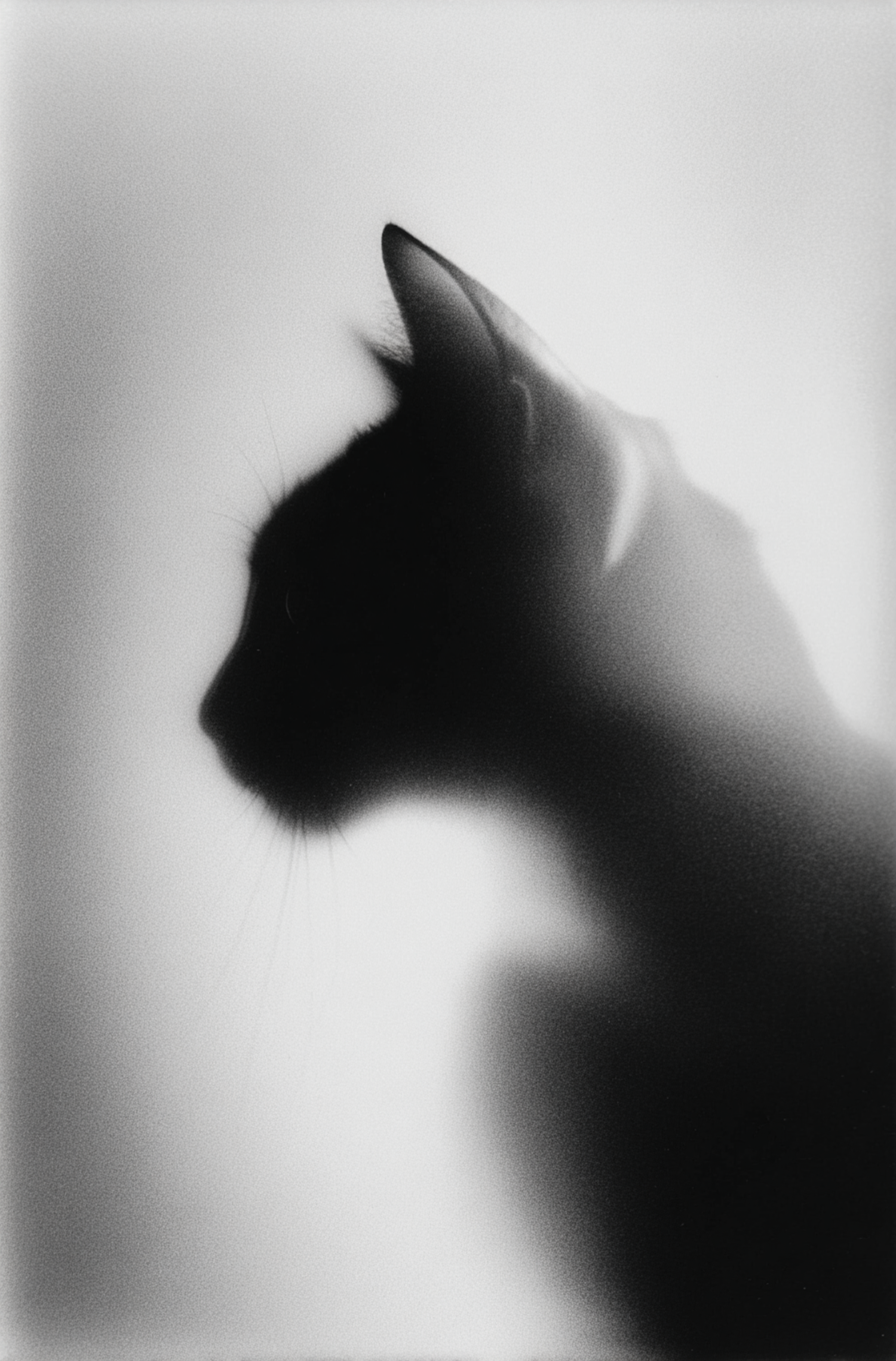 A black-and-white silhouette of a cat's profile, highlighting its ears and whiskers against a softly lit background.