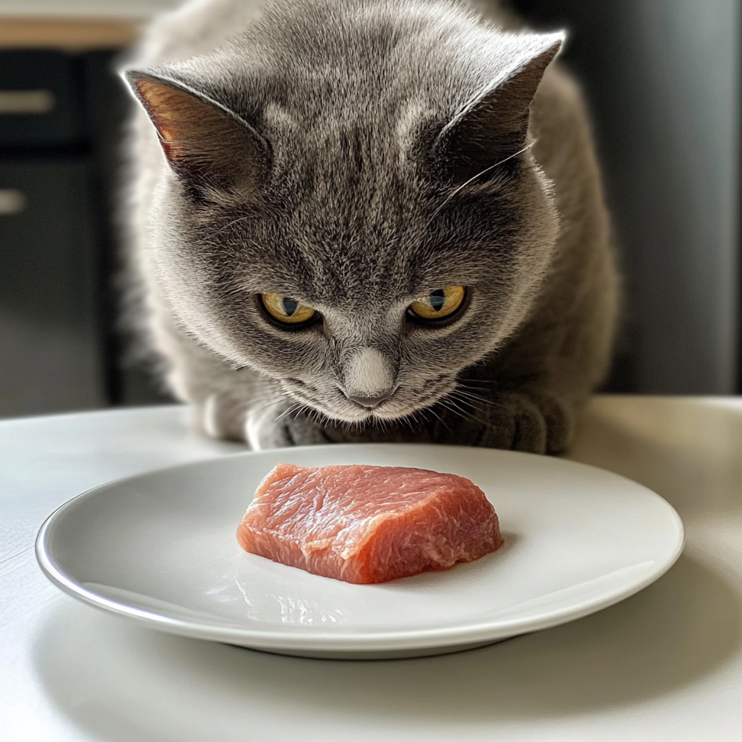 Gray cat with yellow eyes intently stares at raw meat on a white plate, showing curiosity and anticipation.