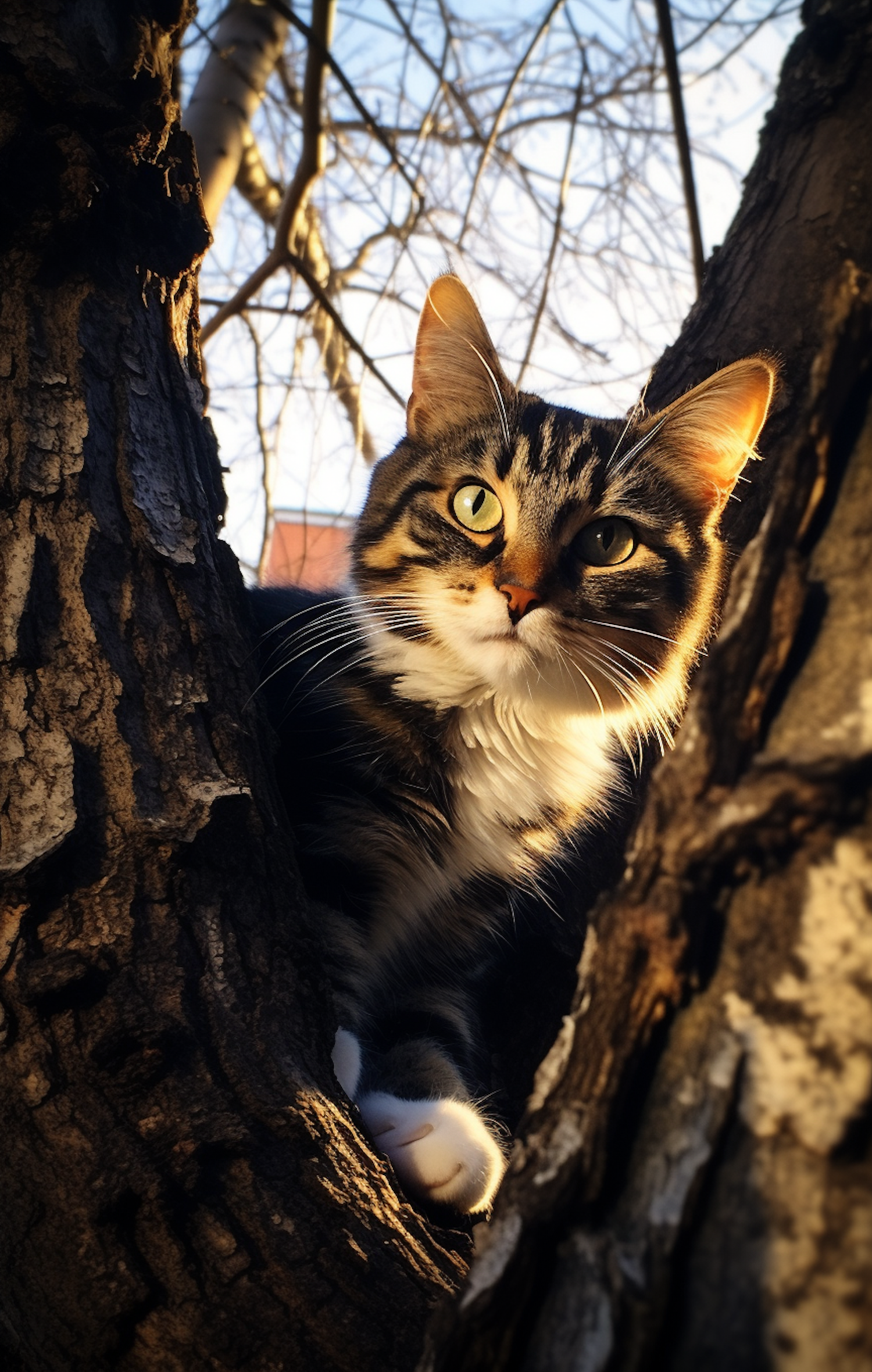 A fluffy tabby cat with green eyes peeks between tree trunks, bathed in warm sunlight, against a backdrop of bare branches.