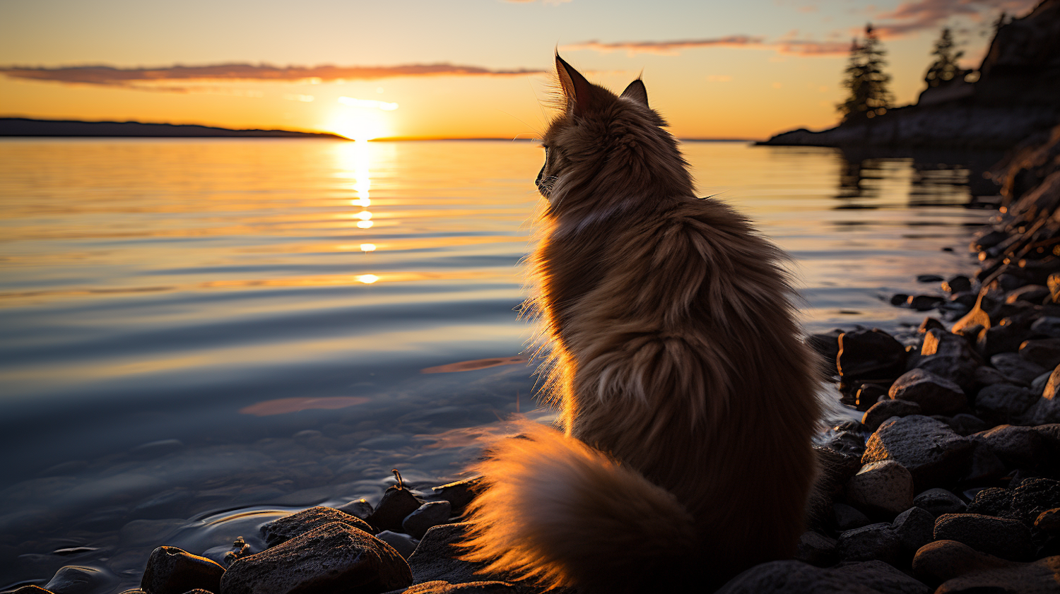 A fluffy cat sits by a lake at sunset, its fur glowing in the warm light. The serene scene features vibrant sky reflections.