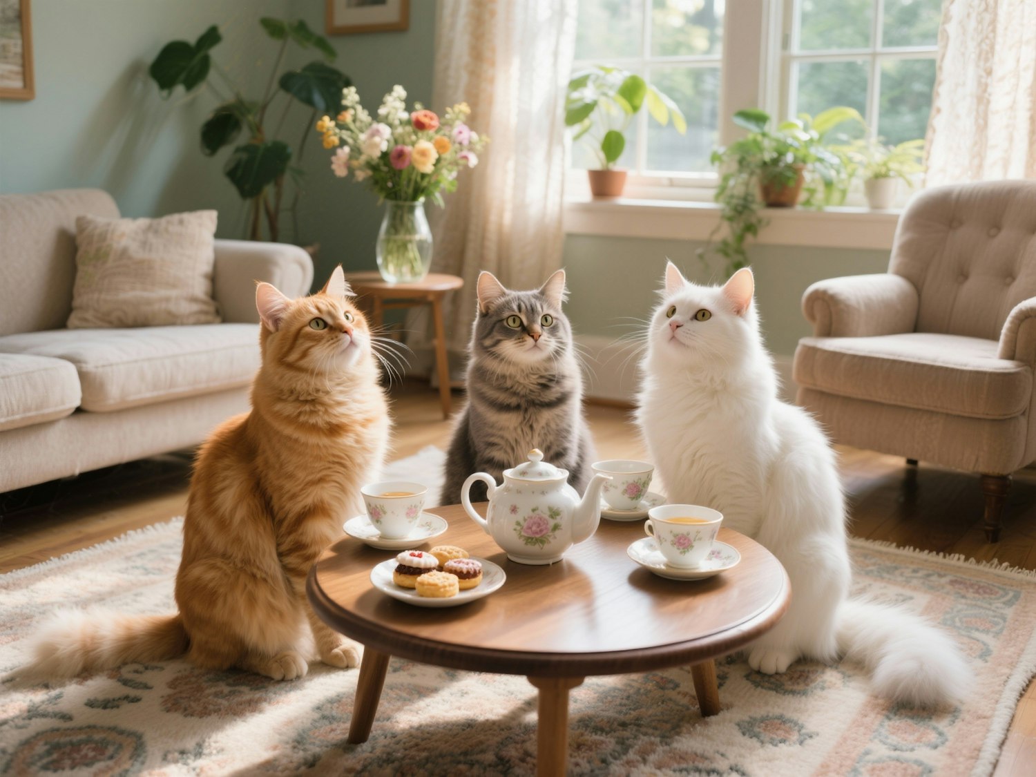 Three adorable cats sit around a tea table in a cozy living room, creating a whimsical and charming scene perfect for cat lovers.
