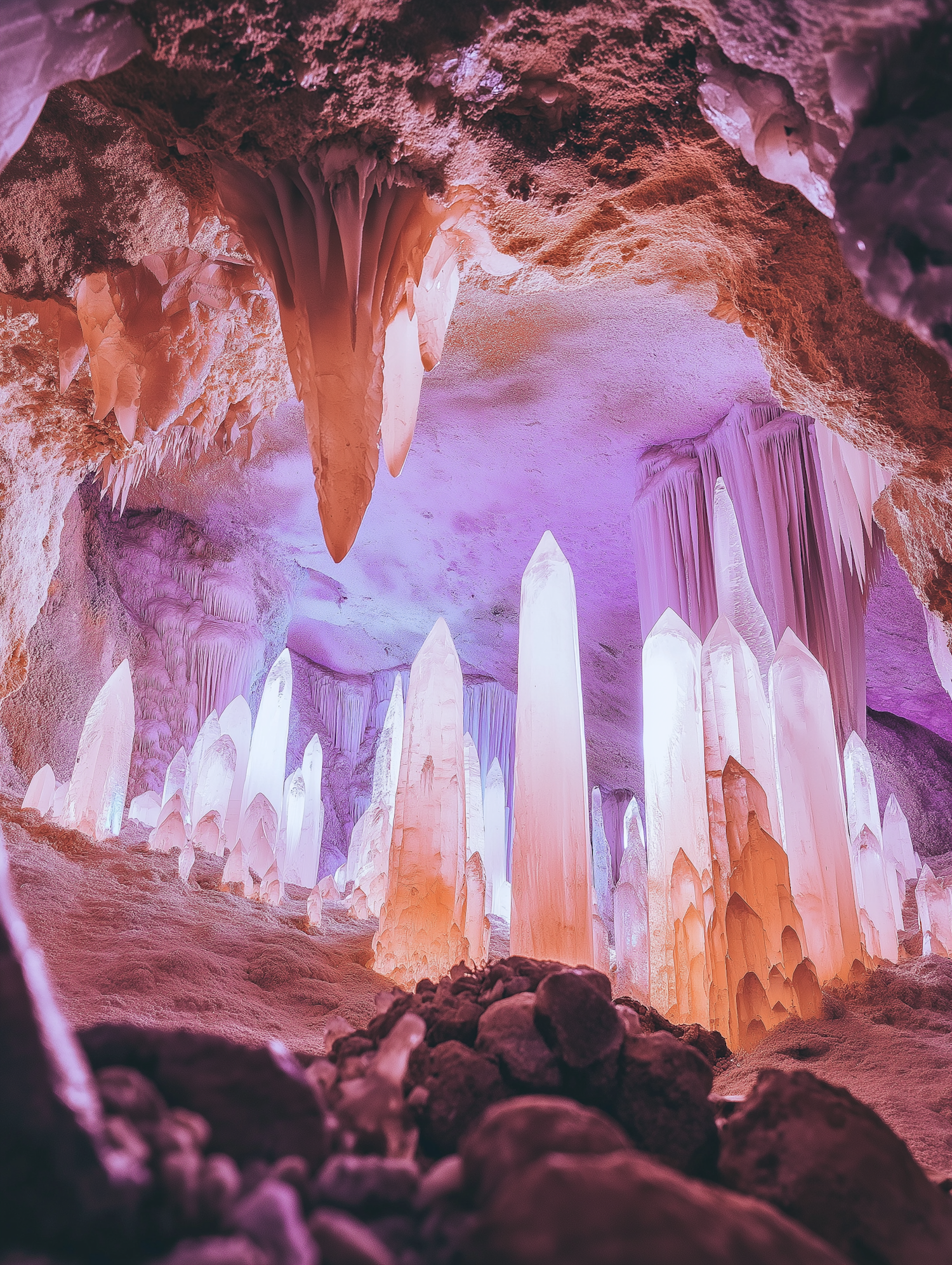 Enchanting cave with glowing crystals in orange, pink, and purple hues, surrounded by stalactites and rocky textures.