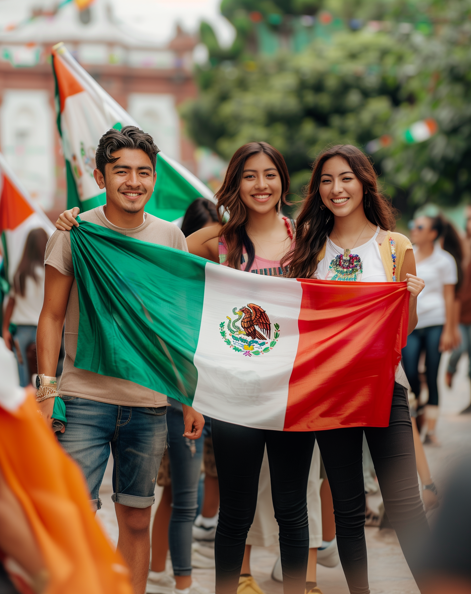 Three young adults joyfully hold a Mexican flag at an outdoor celebration, surrounded by festive decorations and a lively crowd.