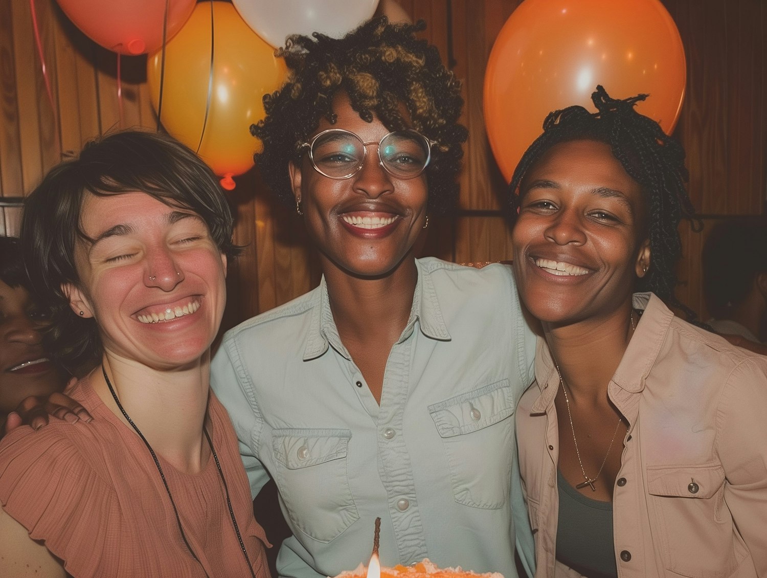 Three friends smiling joyfully with balloons in the background, creating a festive and warm atmosphere.
