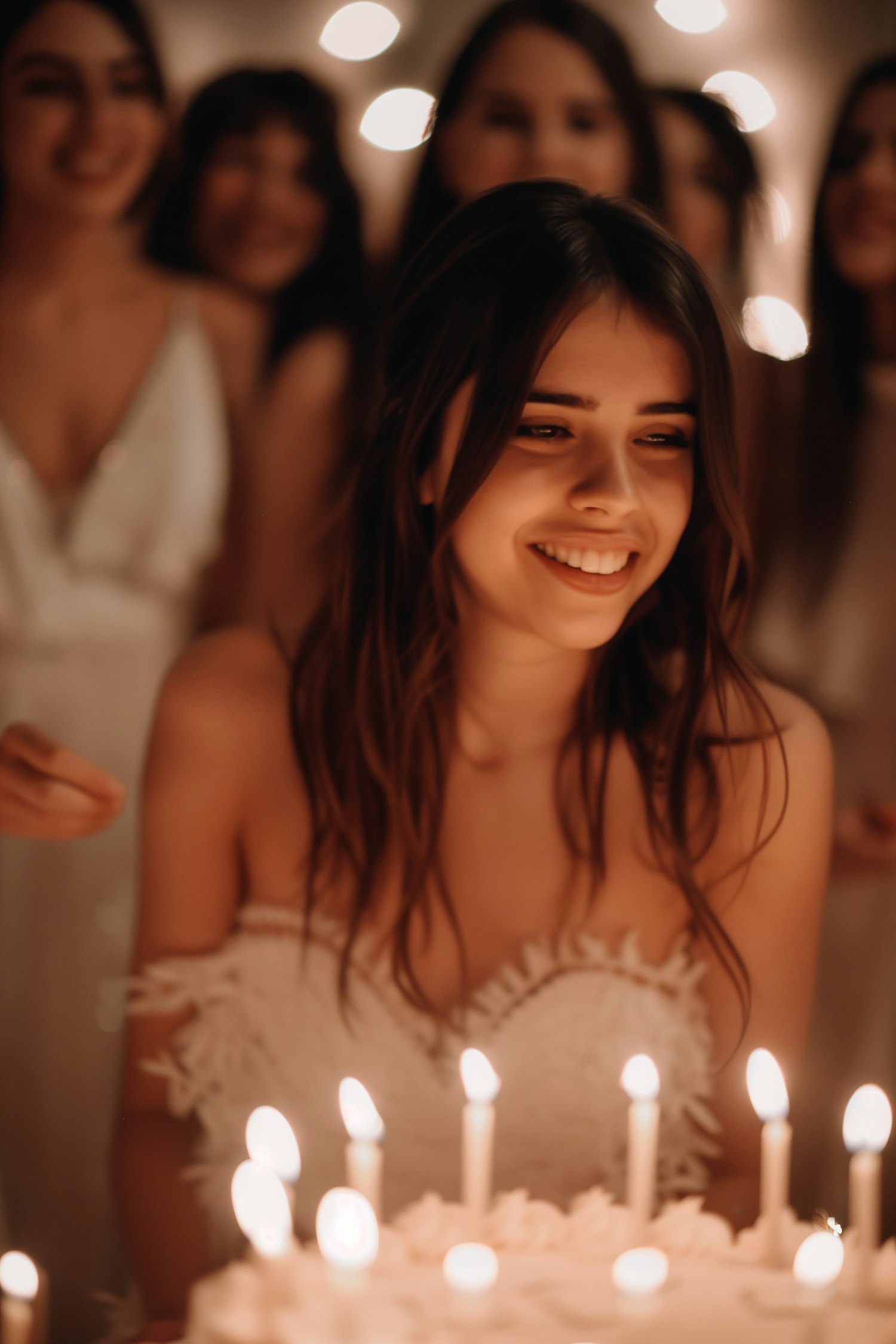 Young woman in white dress smiling at a lit birthday cake, surrounded by friends in a warm, festive atmosphere.