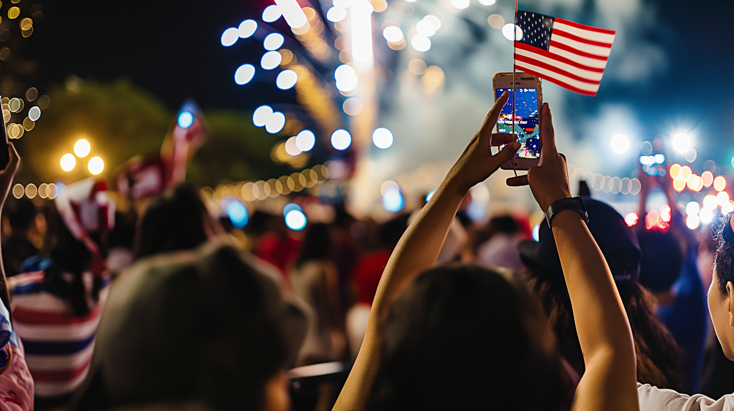 Crowd celebrating at night with fireworks, American flag, and smartphones capturing the moment. Festive and patriotic atmosphere.