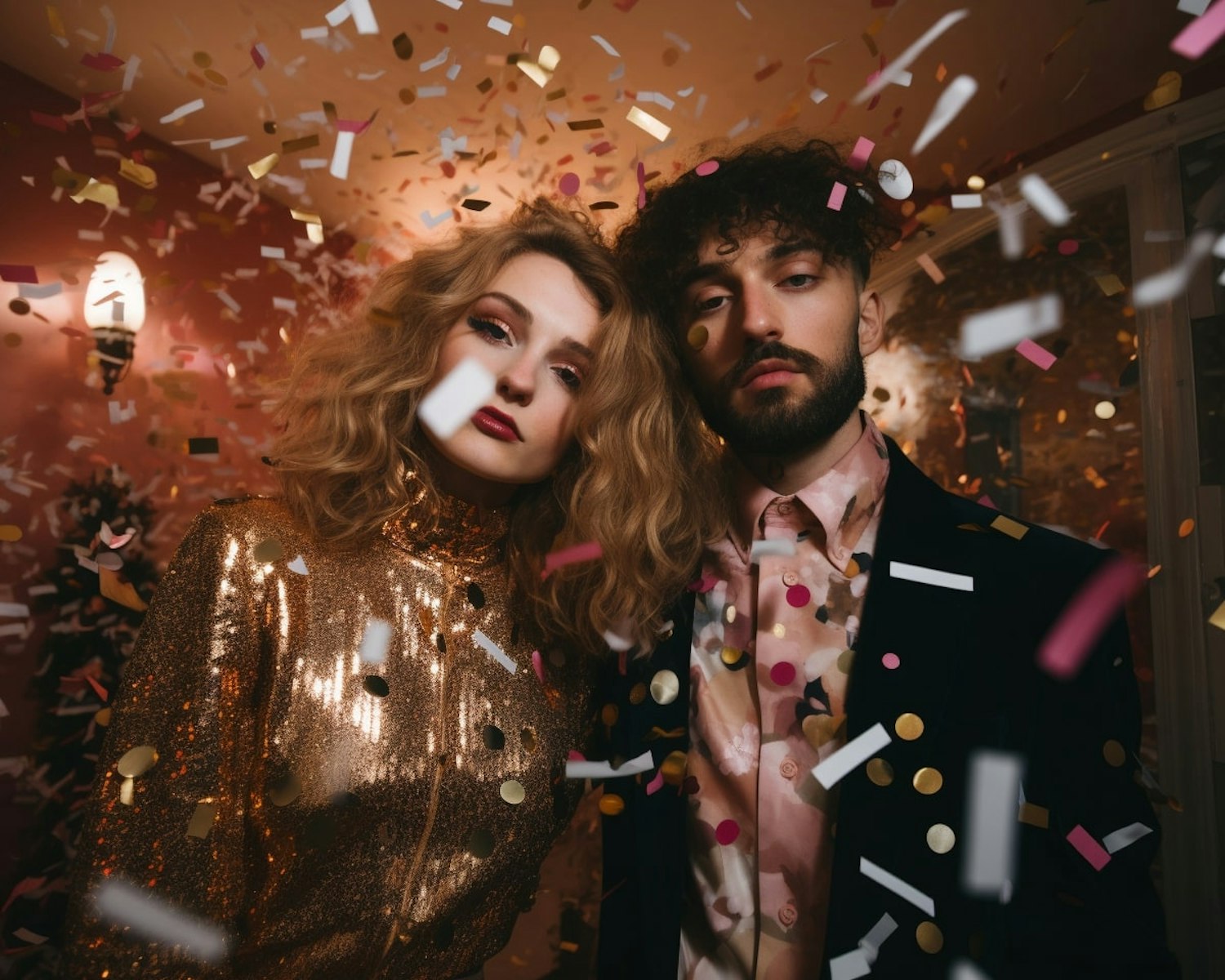 Two stylish individuals in a confetti-filled celebration, wearing a gold sequin dress and a dark suit with a floral shirt.