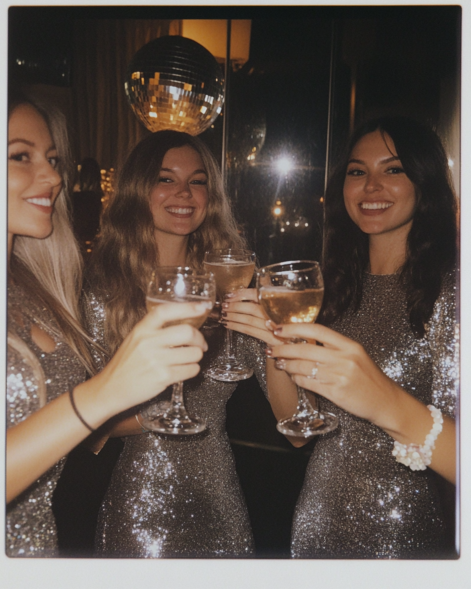 Three women in glittering silver dresses toast with champagne in a festive setting, featuring a disco ball and warm lighting.