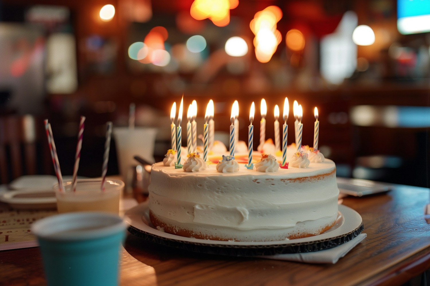 A white frosted cake with colorful candles lit, set on a wooden table in a warm, festive setting.