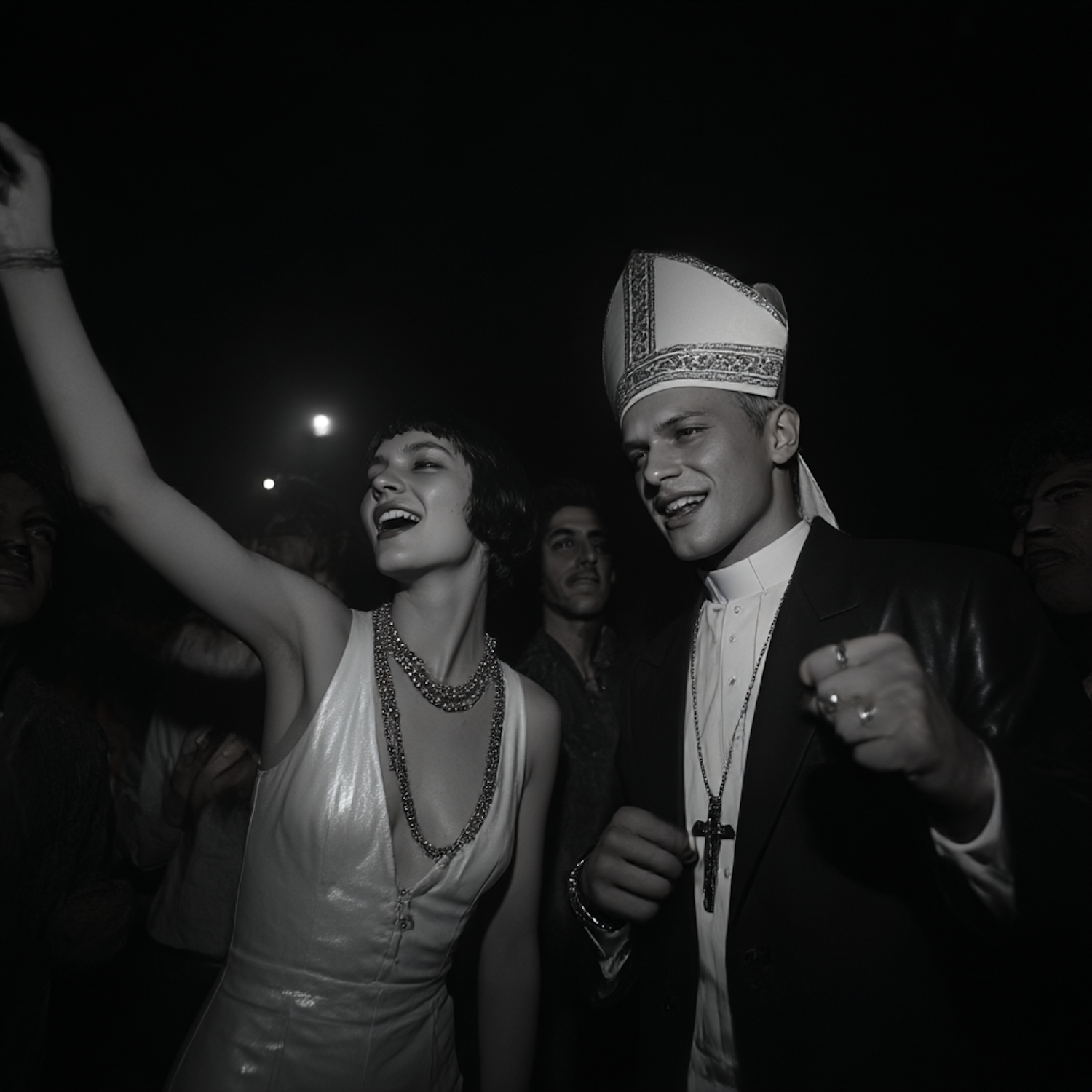 A black-and-white photo of two people celebrating, one in a shiny dress and the other in a clerical outfit, surrounded by a lively crowd.