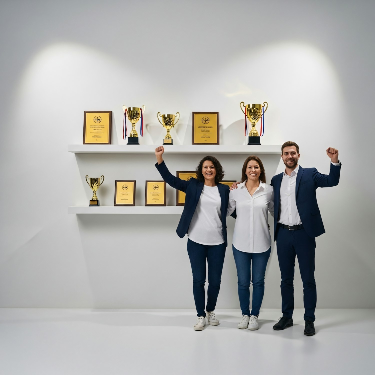 Three professionals celebrate in front of a shelf filled with trophies and plaques, showcasing their achievements.