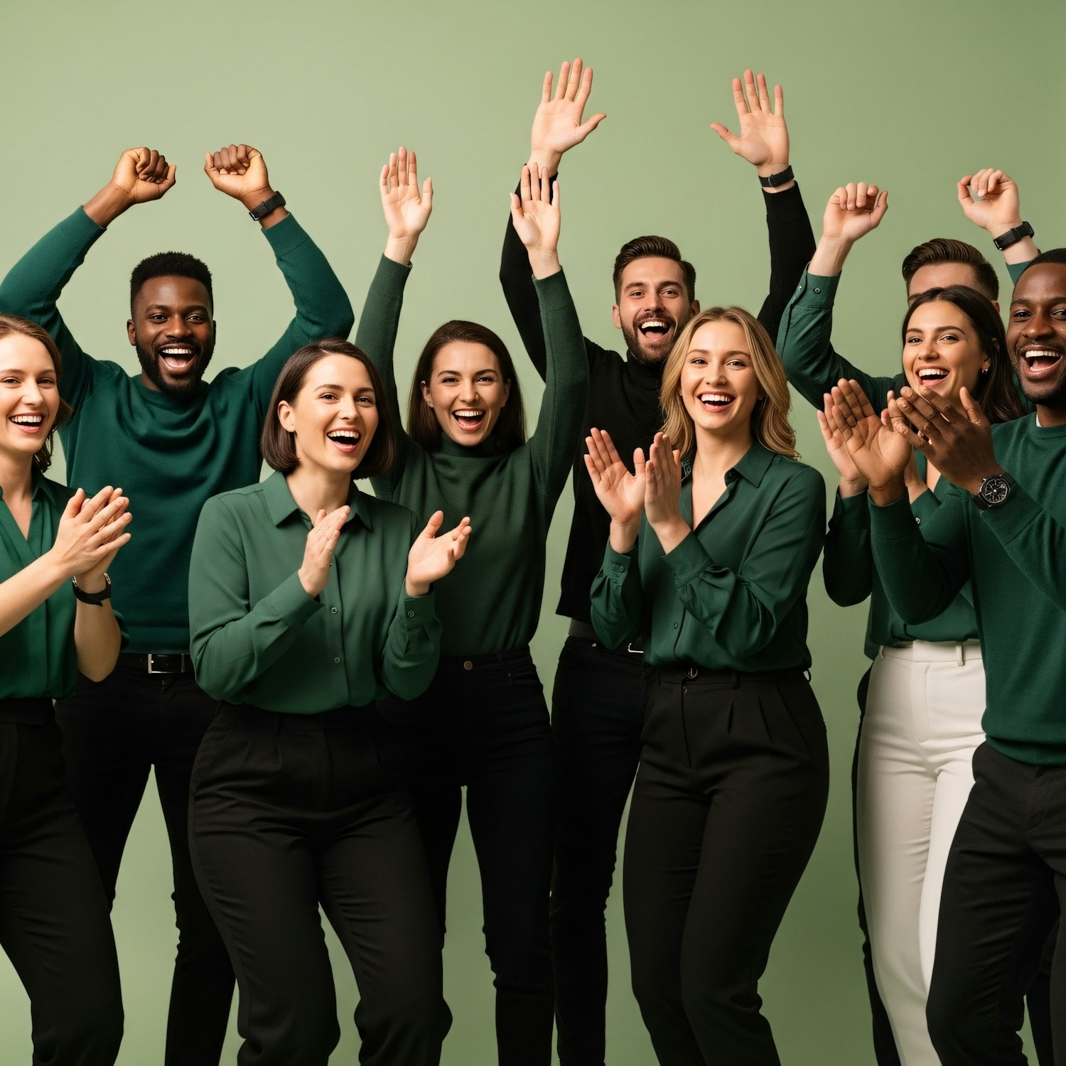 A cheerful group of people in green and black attire celebrating together against a light green background, radiating unity and joy.