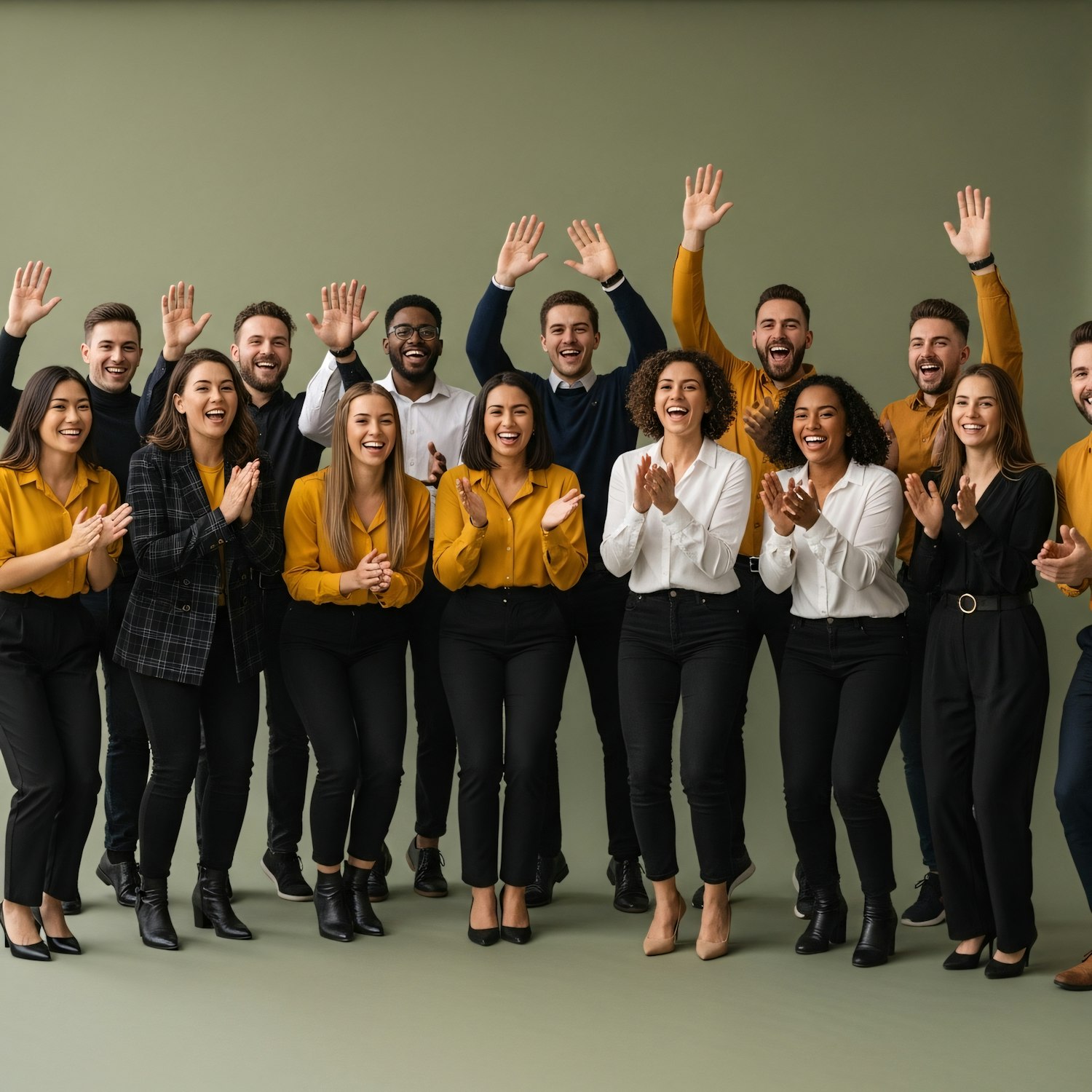 A diverse group of people celebrating together, dressed in coordinated outfits, against a plain olive green background.
