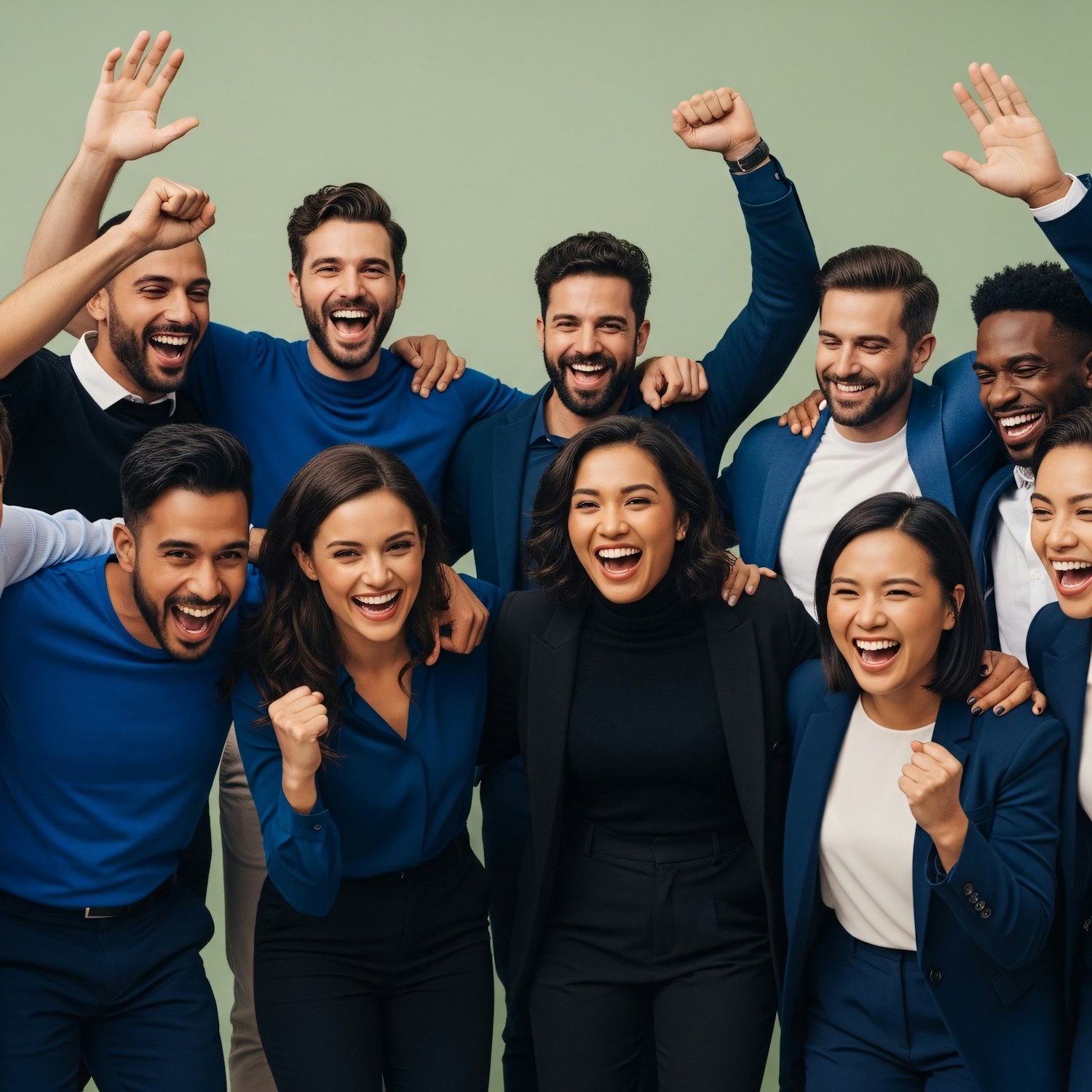 A diverse group of professionals smiling and cheering together against a light green background, showcasing unity and celebration.