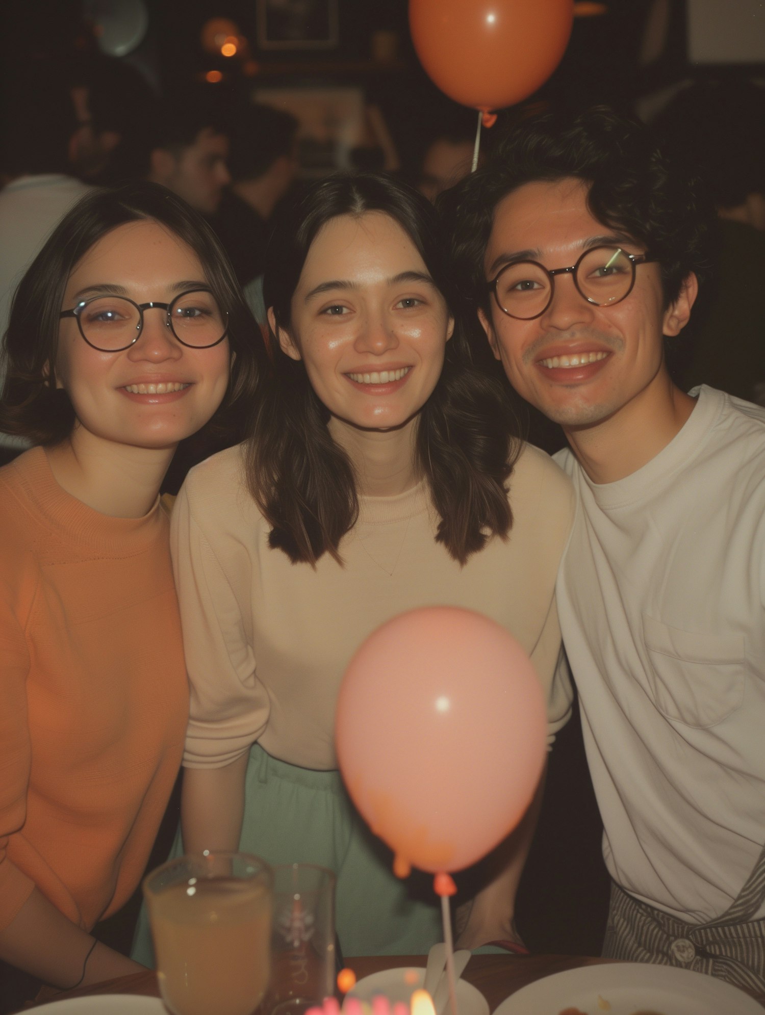 Three friends smiling at a party with a pink balloon and drinks, creating a warm and festive atmosphere.