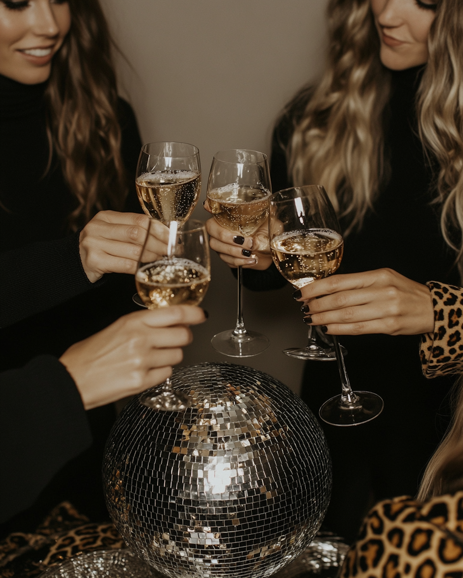 Celebratory toast with champagne glasses and a disco ball, featuring stylish outfits and a festive atmosphere.