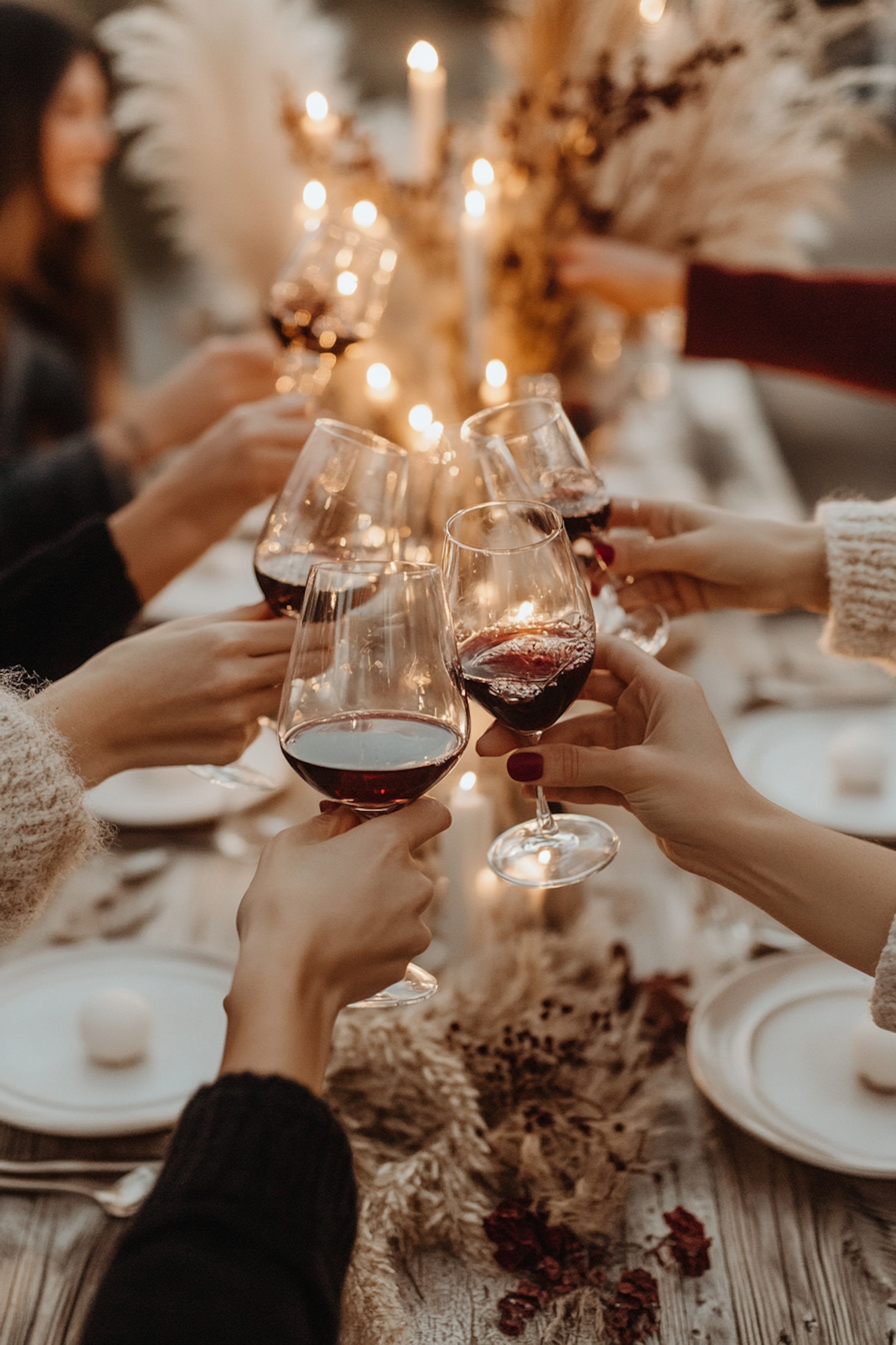 A warm, candlelit toast with wine glasses around a rustic table, creating a festive and intimate atmosphere.