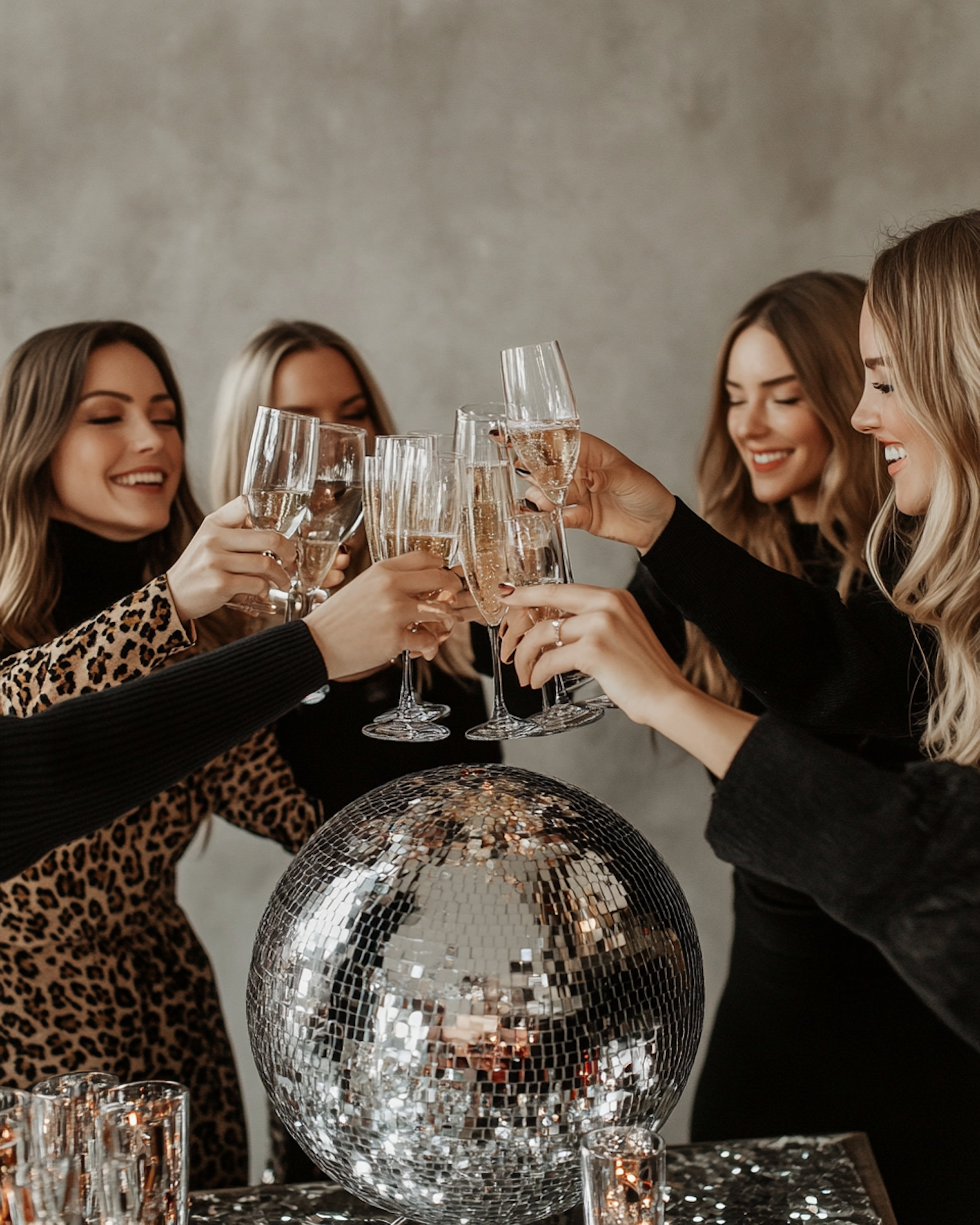 Five women toasting with champagne glasses around a disco ball, dressed in elegant attire, celebrating joyfully.