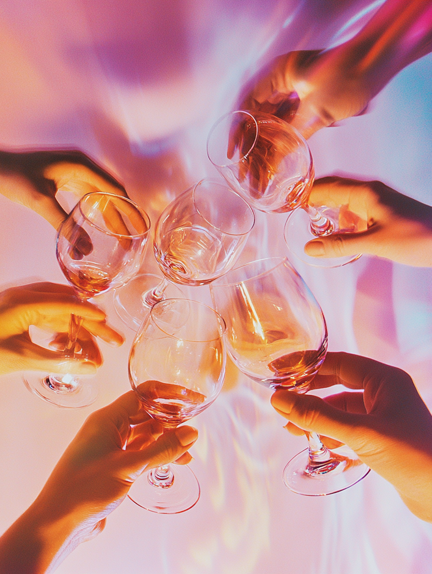 Six hands toasting with wine glasses filled with rosé, set against a vibrant pink and purple background.