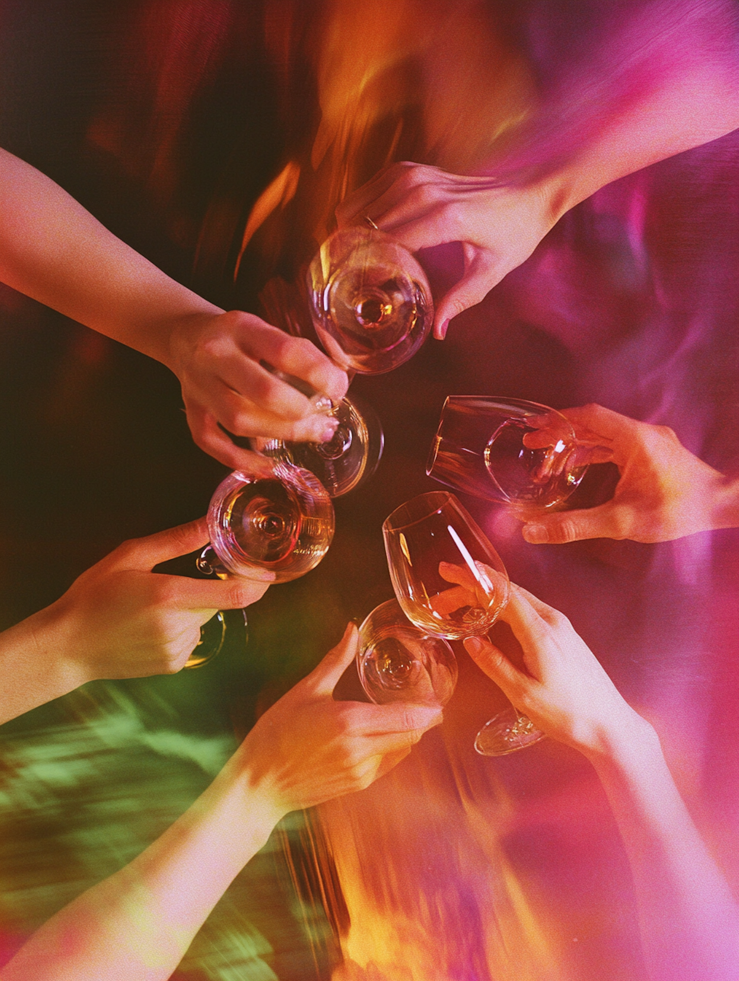 Hands holding wine glasses in a celebratory toast with vibrant pink, orange, and green hues creating a festive atmosphere.