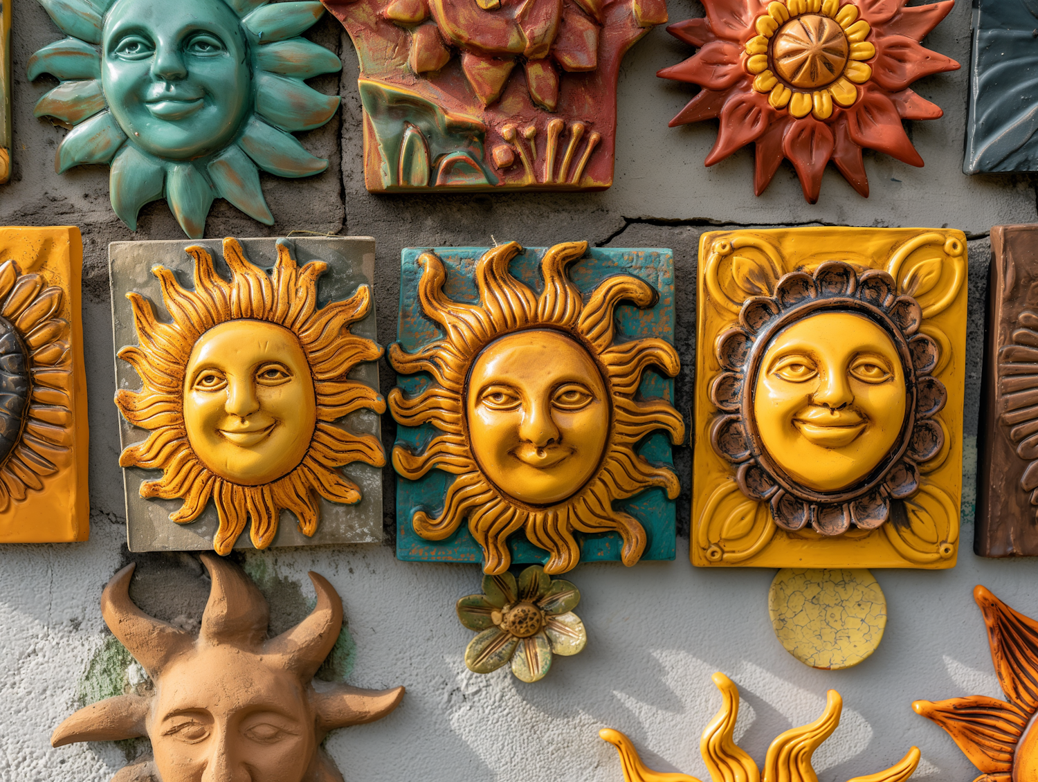 Colorful ceramic sun faces with intricate designs and vibrant hues create a lively wall art display.
