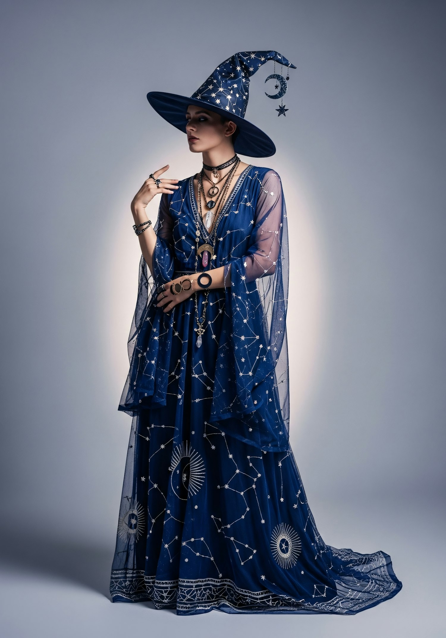 A person in a celestial-themed costume with a starry blue gown and matching hat, accessorized with mystical jewelry, in a neutral setting.