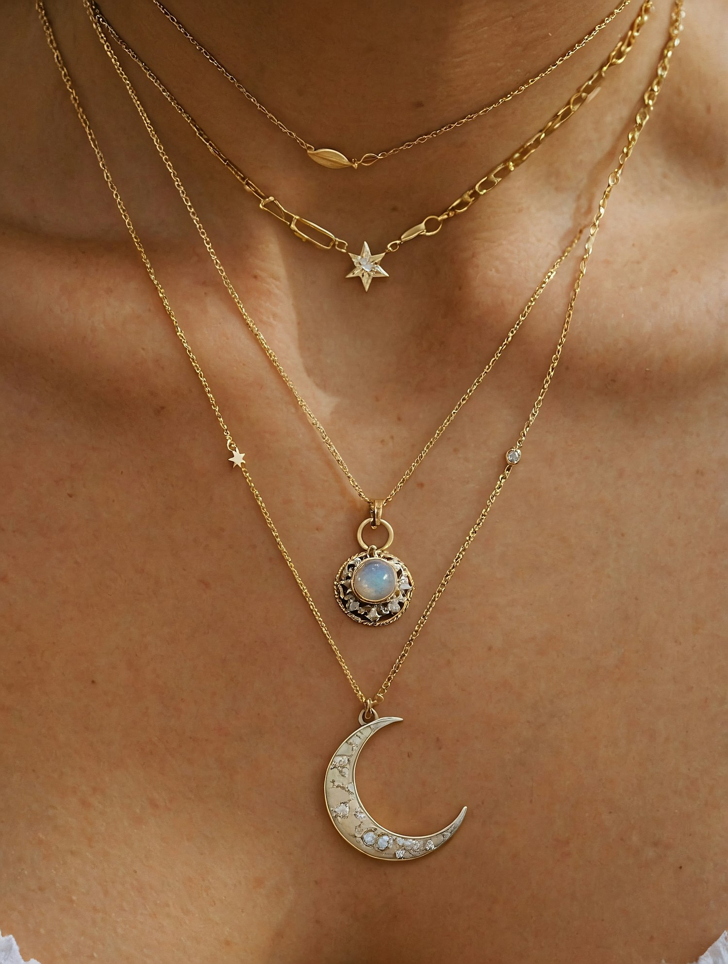 Elegant layered gold necklaces with star, moon, and gemstone pendants on a light brown skin tone.