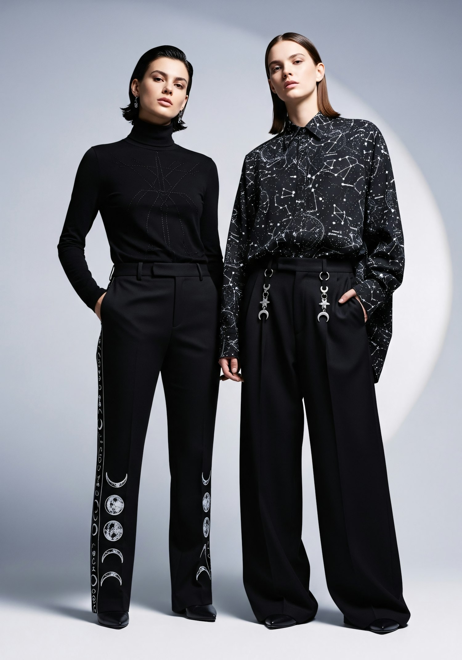Two individuals in celestial-themed black outfits, featuring constellation prints and moon phase designs, standing against a gradient background.