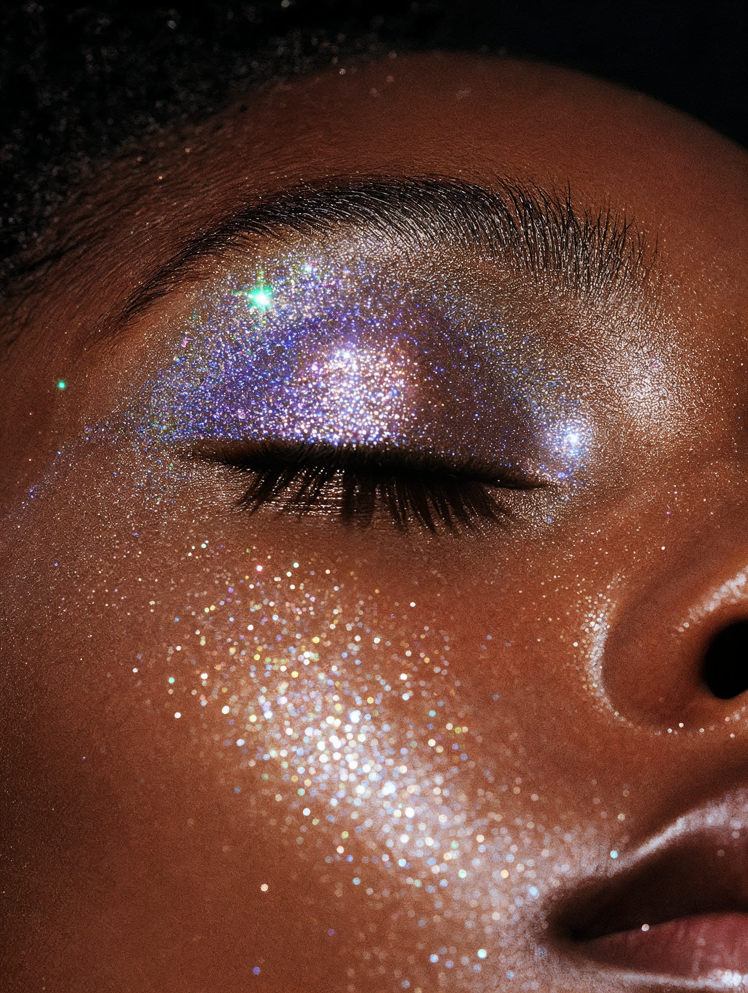Close-up of glittery makeup on dark skin, featuring shimmering purple and silver eyeshadow with radiant sparkles on the cheek.
