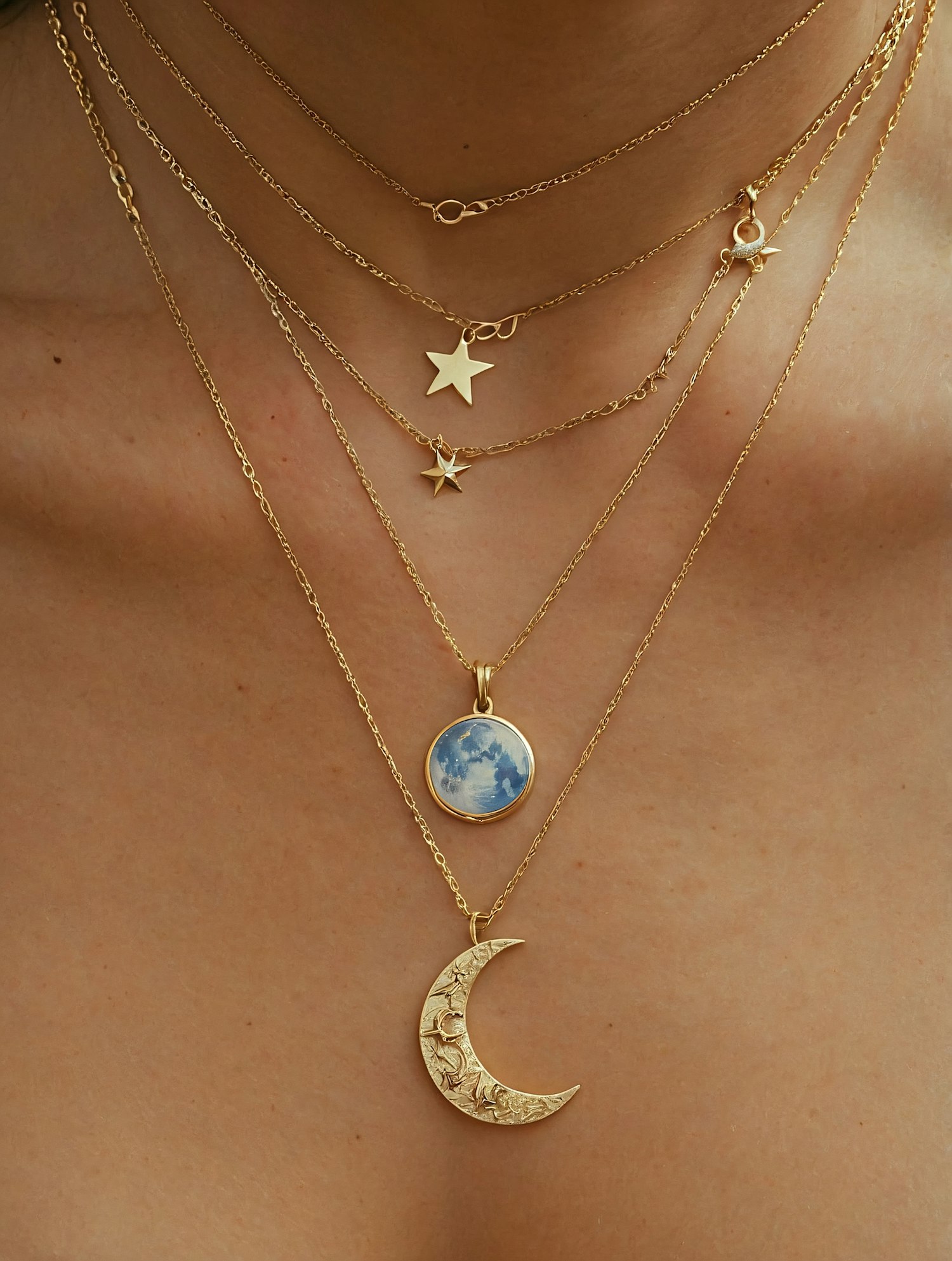 Elegant layered gold necklaces with star and moon pendants on light brown skin, creating a celestial and stylish look.