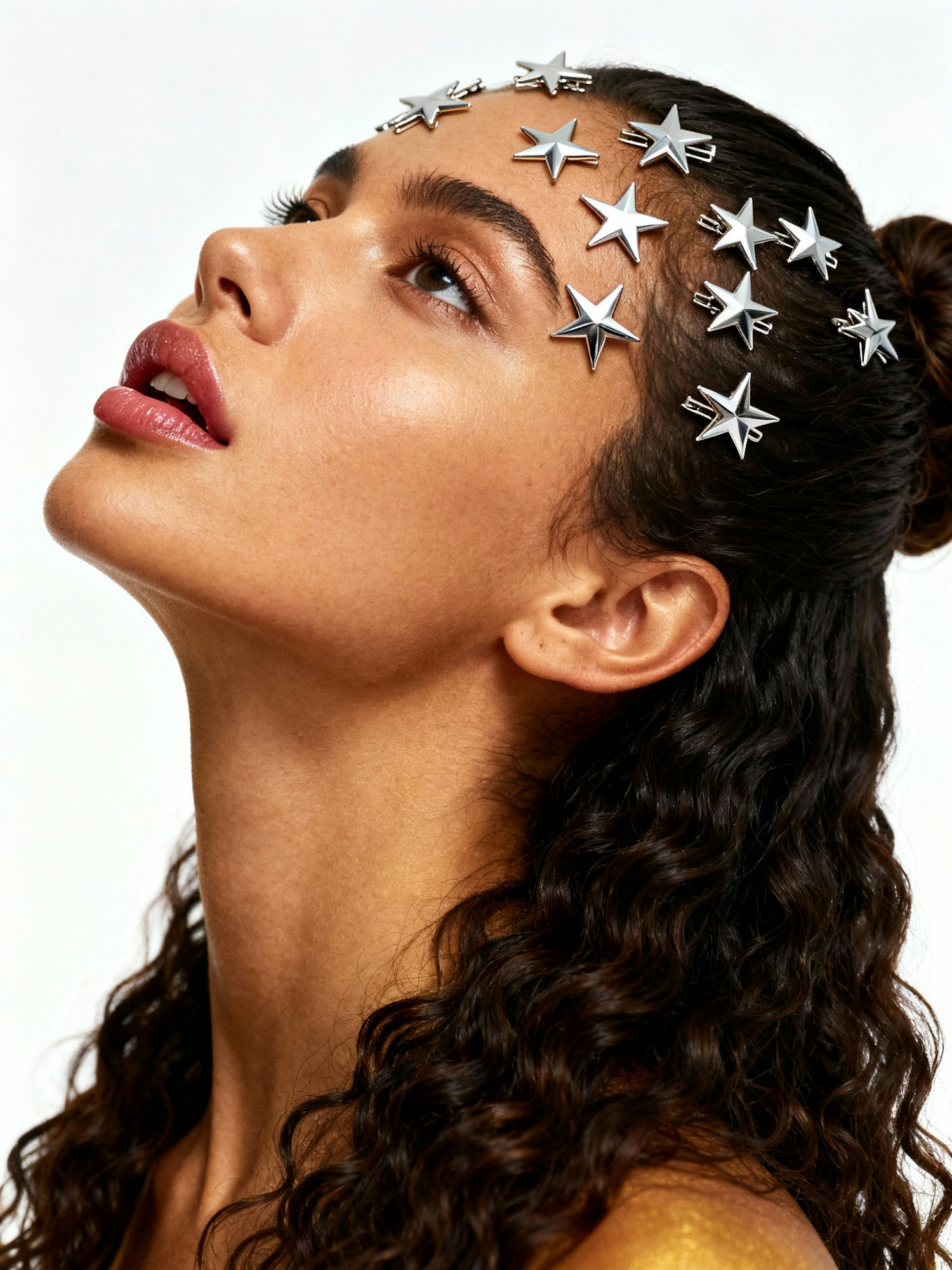 Studio portrait, plain white seamless background, soft even lighting, clean editorial aesthetic, no shadows, high detail, realistic photography, sharp focus on face and hair accessories Three-quarter portrait of a young woman with warm golden skin and long curly dark hair pulled into a half-up style. She tilts her head back, lips parted, looking slightly upward. Her hair is decorated with metallic silver star-shaped barrettes scattered across the crown, creating a celestial, futuristic effect.