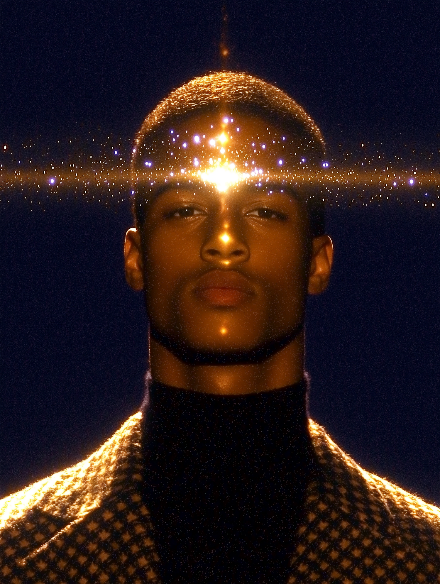 A young man in a houndstooth jacket with a radiant golden light on his forehead, surrounded by glowing particles against a dark blue background.