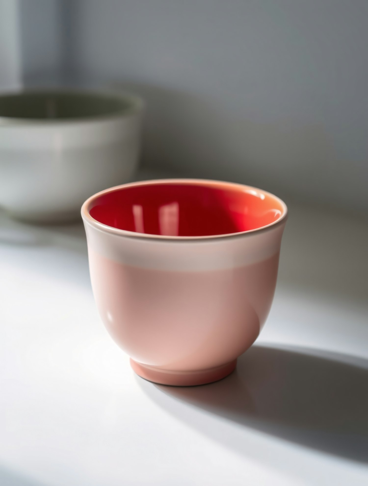 Elegant pink ceramic bowl with a vibrant red interior on a white surface, casting a soft shadow. Minimalist and modern design.