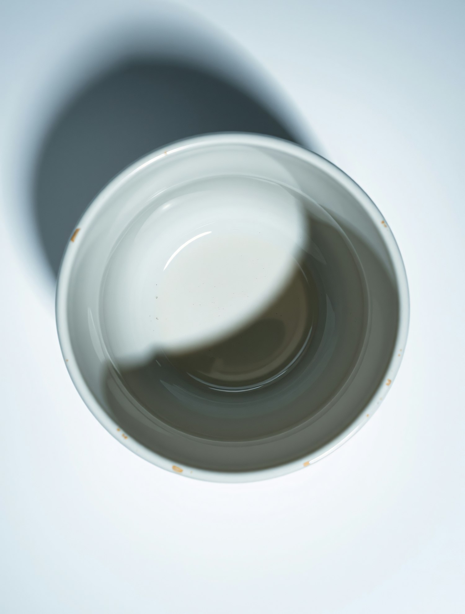 White ceramic bowl with brown specks casting a shadow on a light blue background, creating a minimalist and elegant composition.