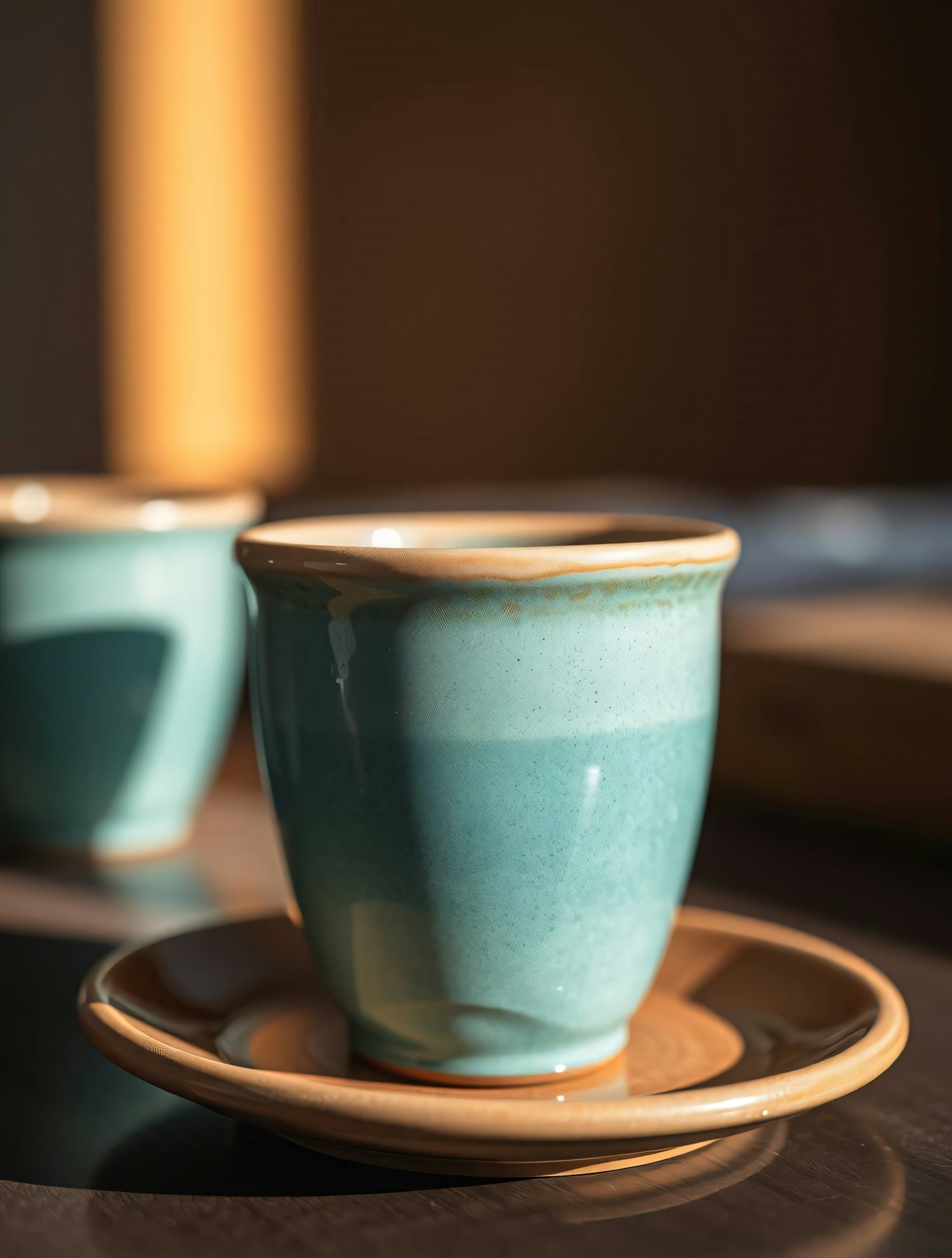 Close-up of a turquoise ceramic cup and saucer in warm sunlight, creating a cozy and inviting atmosphere.