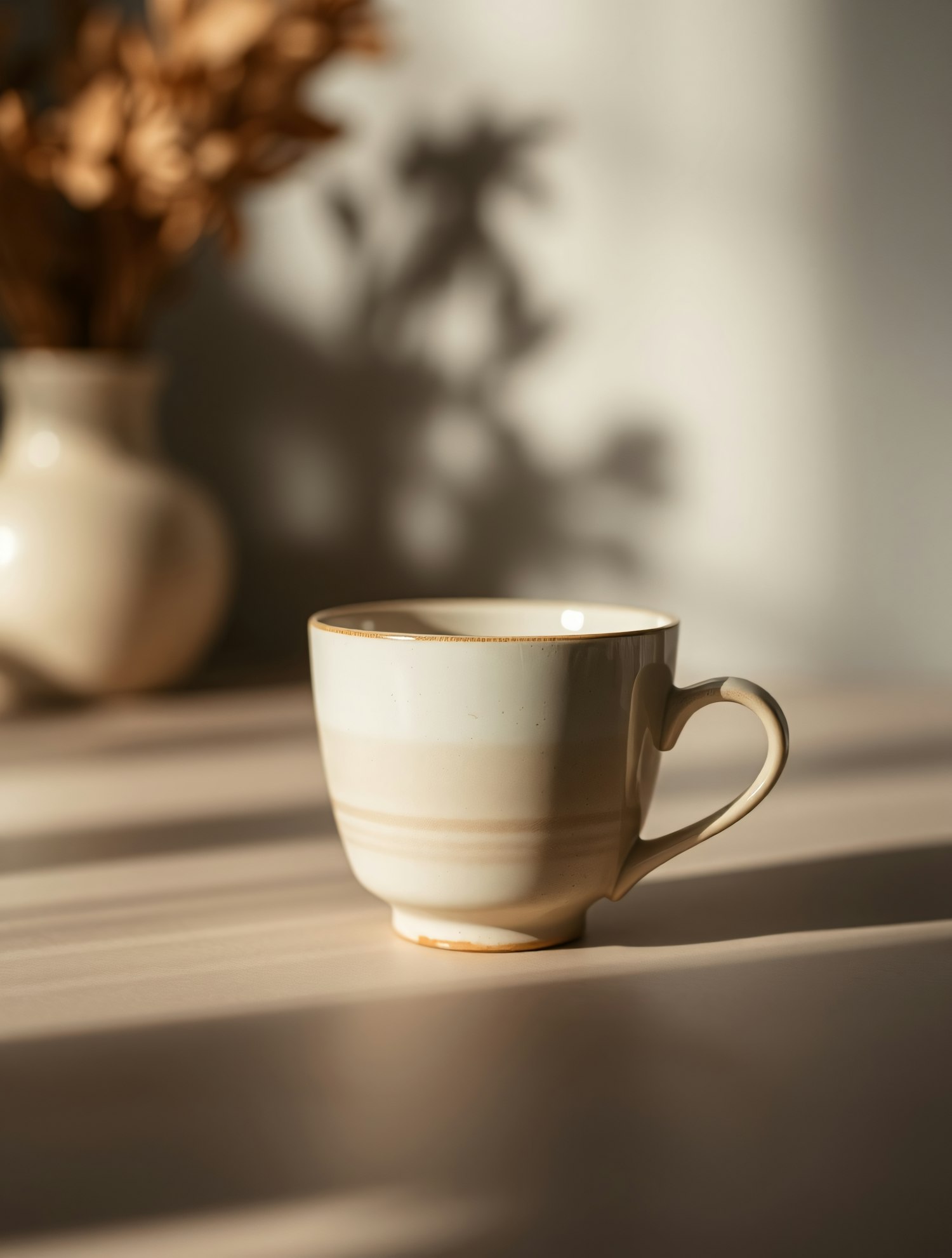 Elegant cream ceramic mug on a sunlit table with a vase of dried flowers casting shadows, creating a serene and cozy atmosphere.