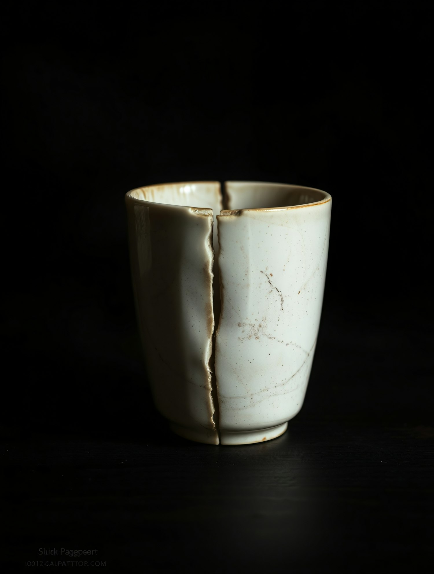 A cracked white ceramic cup repaired with gold, showcasing the art of Kintsugi against a dark background.