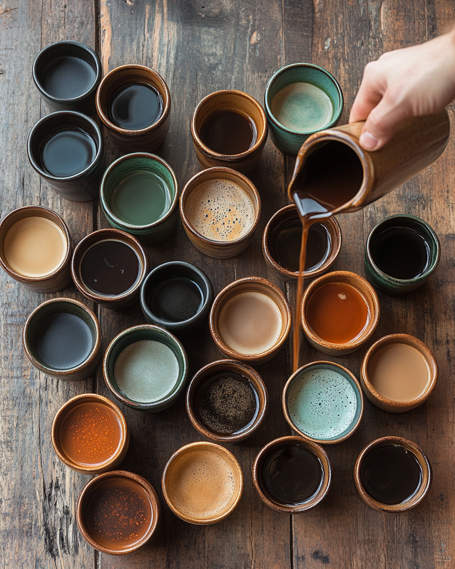A variety of ceramic cups filled with different coffee shades on a rustic table, with a hand pouring coffee from a pitcher.