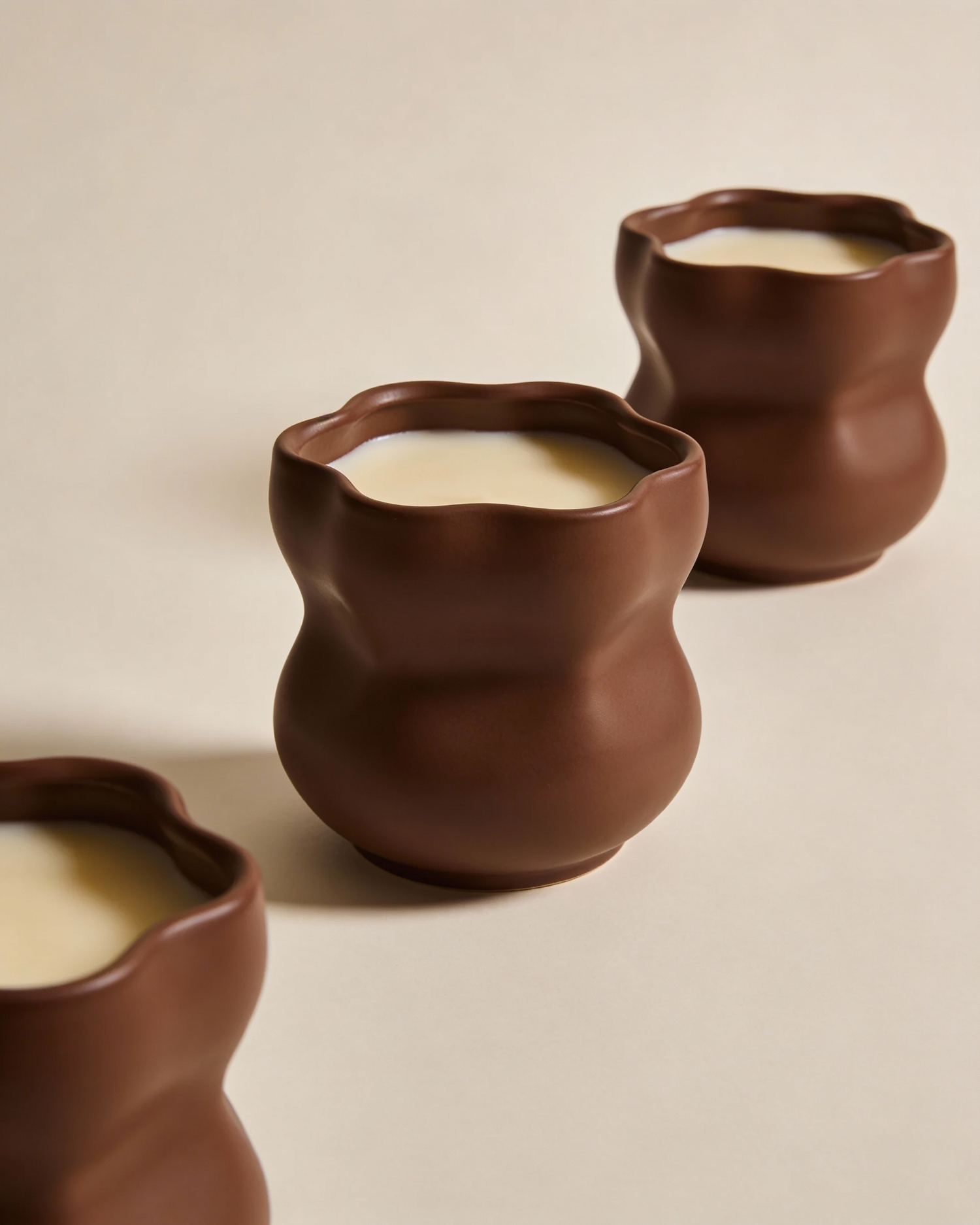 Three brown ceramic cups with a wavy design, filled with a creamy liquid, arranged diagonally on a beige surface.