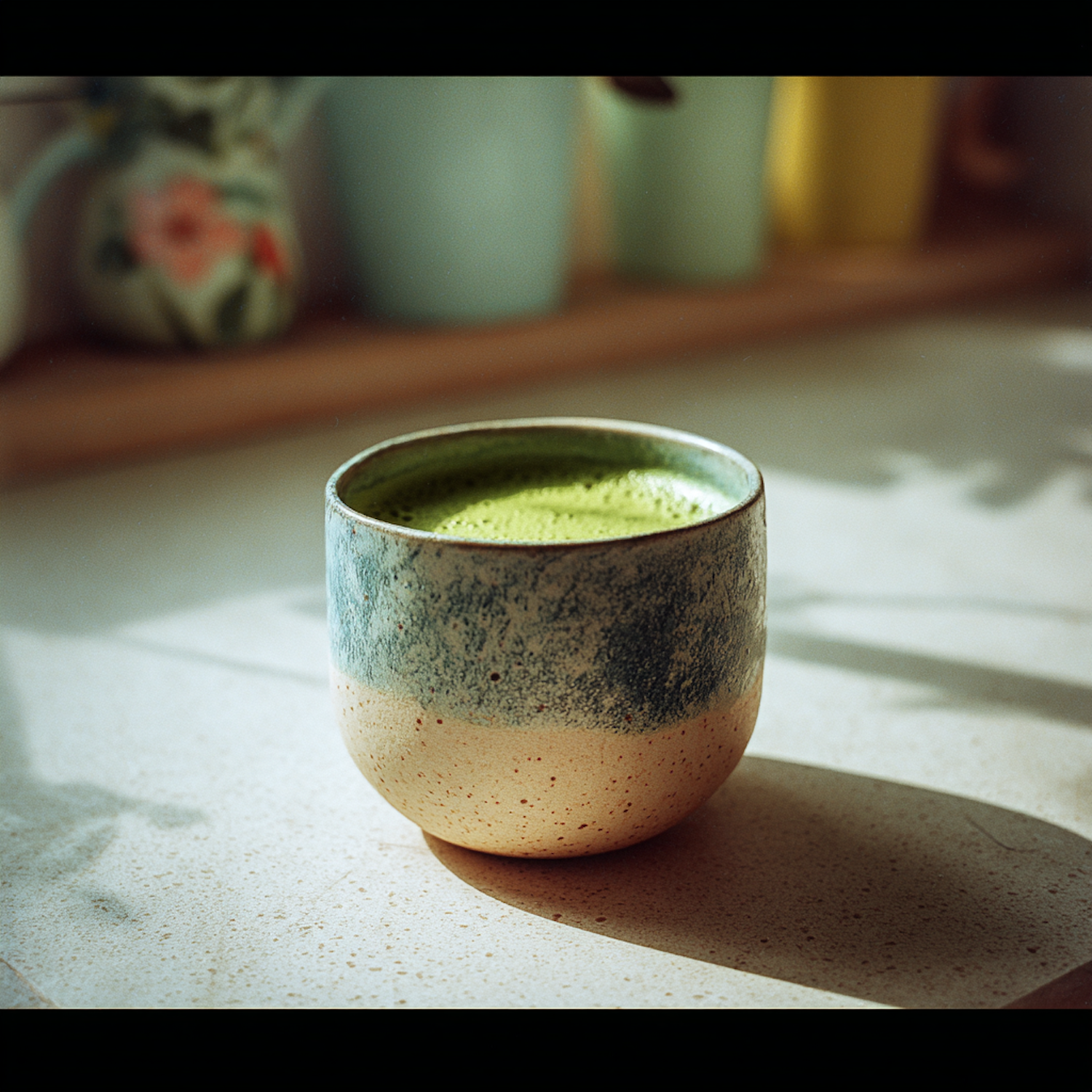 A ceramic cup of matcha tea on a sunlit counter, with a textured blue and beige glaze and a soft, inviting background.